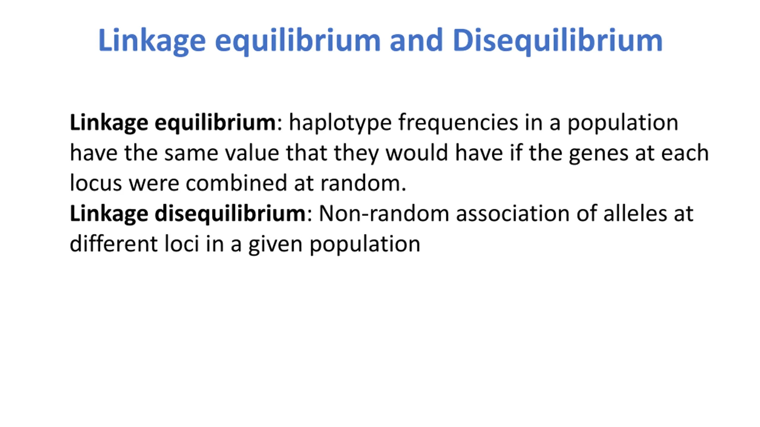 Linkage equilibrium and Disequilibrium Linkage equilibrium: haplotype frequencies in a population have the same value that they would have if the genes at each locus were combined at random. Linkage disequilibrium: Non-random association of alleles at different loci in a given population