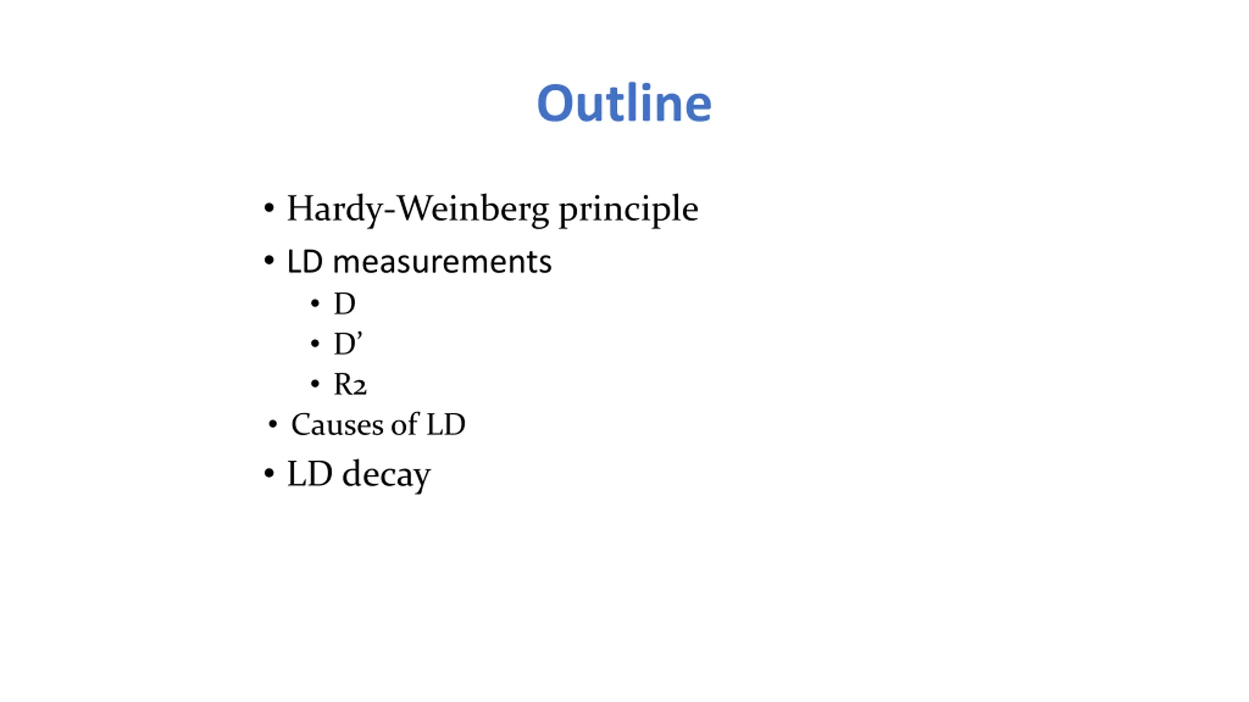 Outline Hardy-Weinberg principle LD measurements D D R2 Causes of LD LD decay