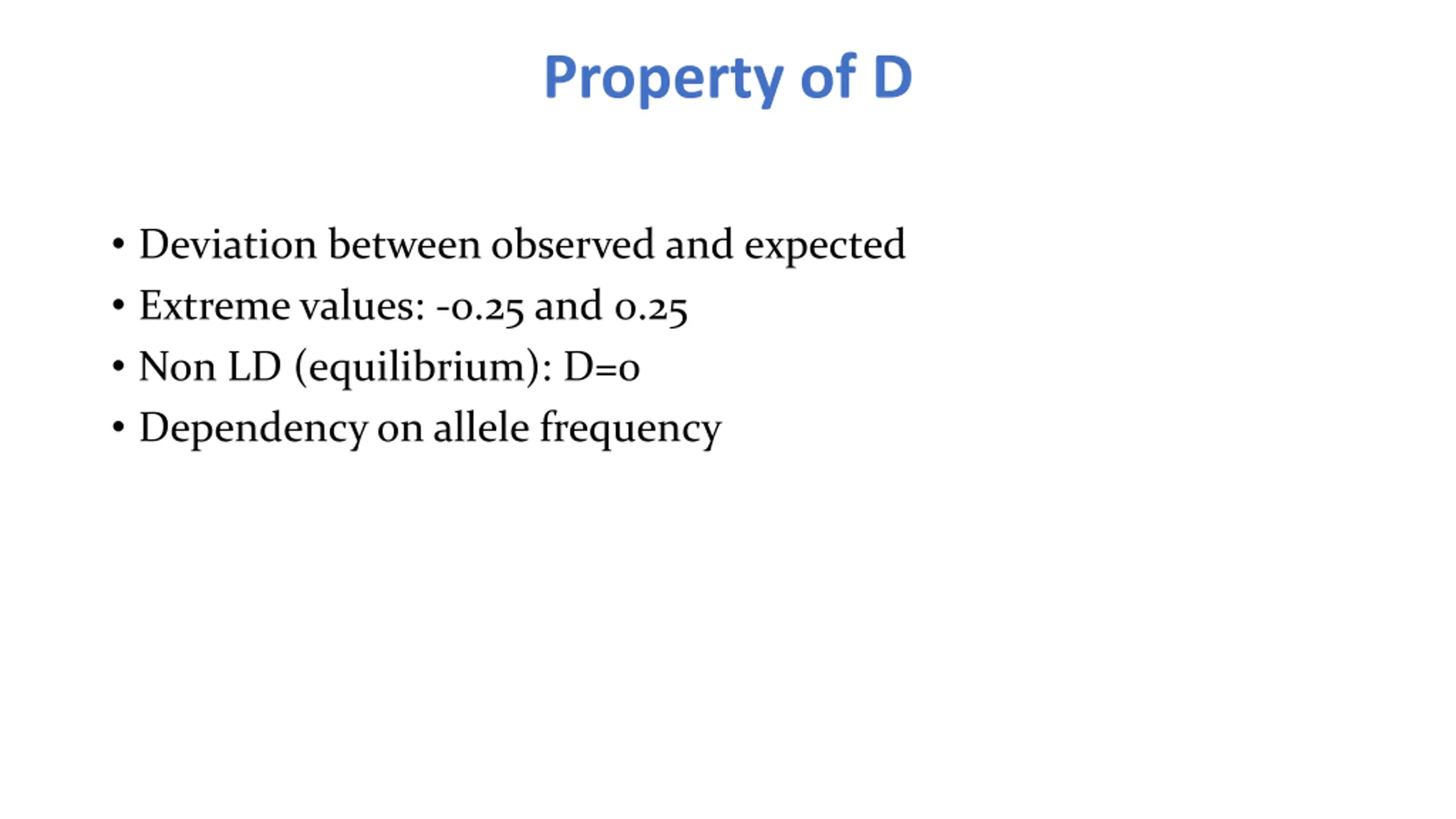 Property of D Deviation between observed and expected Extreme values: -0.25 and 0.25 Non LD (equilibrium): D=0 Dependency on allele frequency