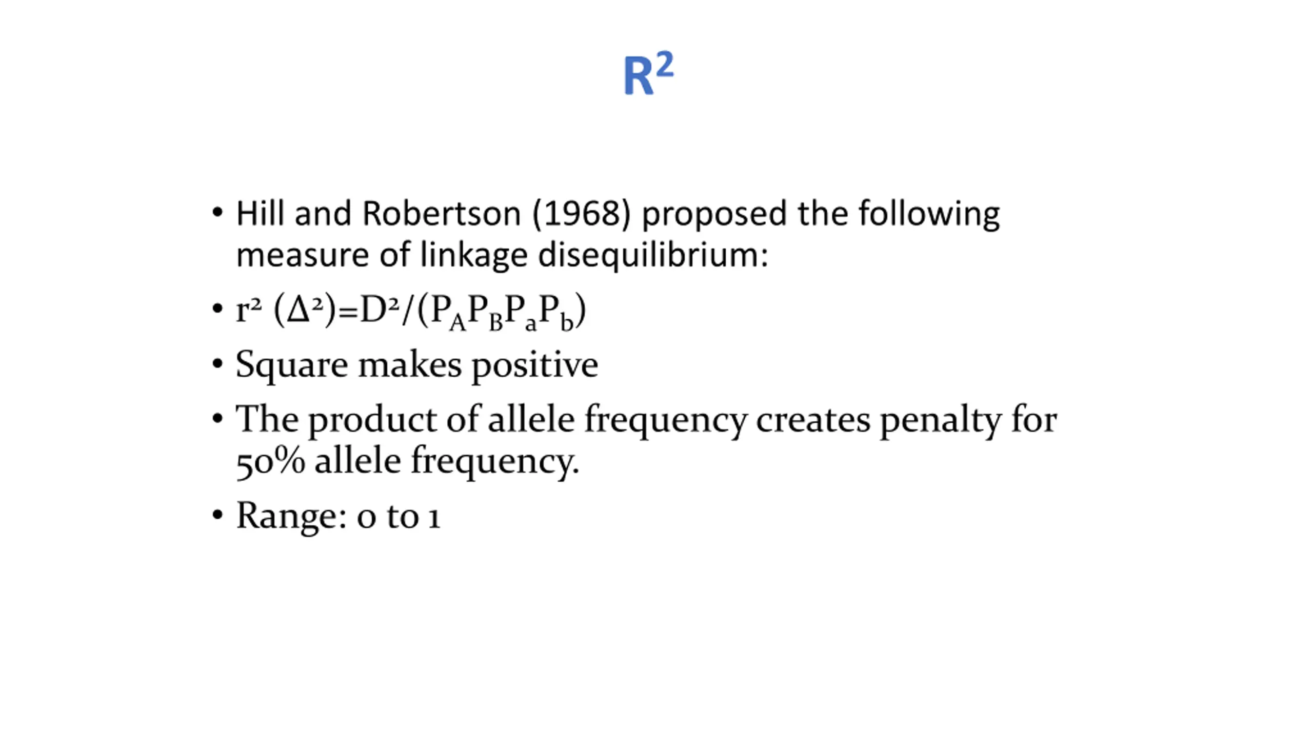 R2 Hill and Robertson (1968) proposed the following measure of linkage disequilibrium: r2 ( 2)=D2/(PAPBPaPb) Square makes positive The product of allele frequency creates penalty for 50% allele frequency. Range: 0 to 1