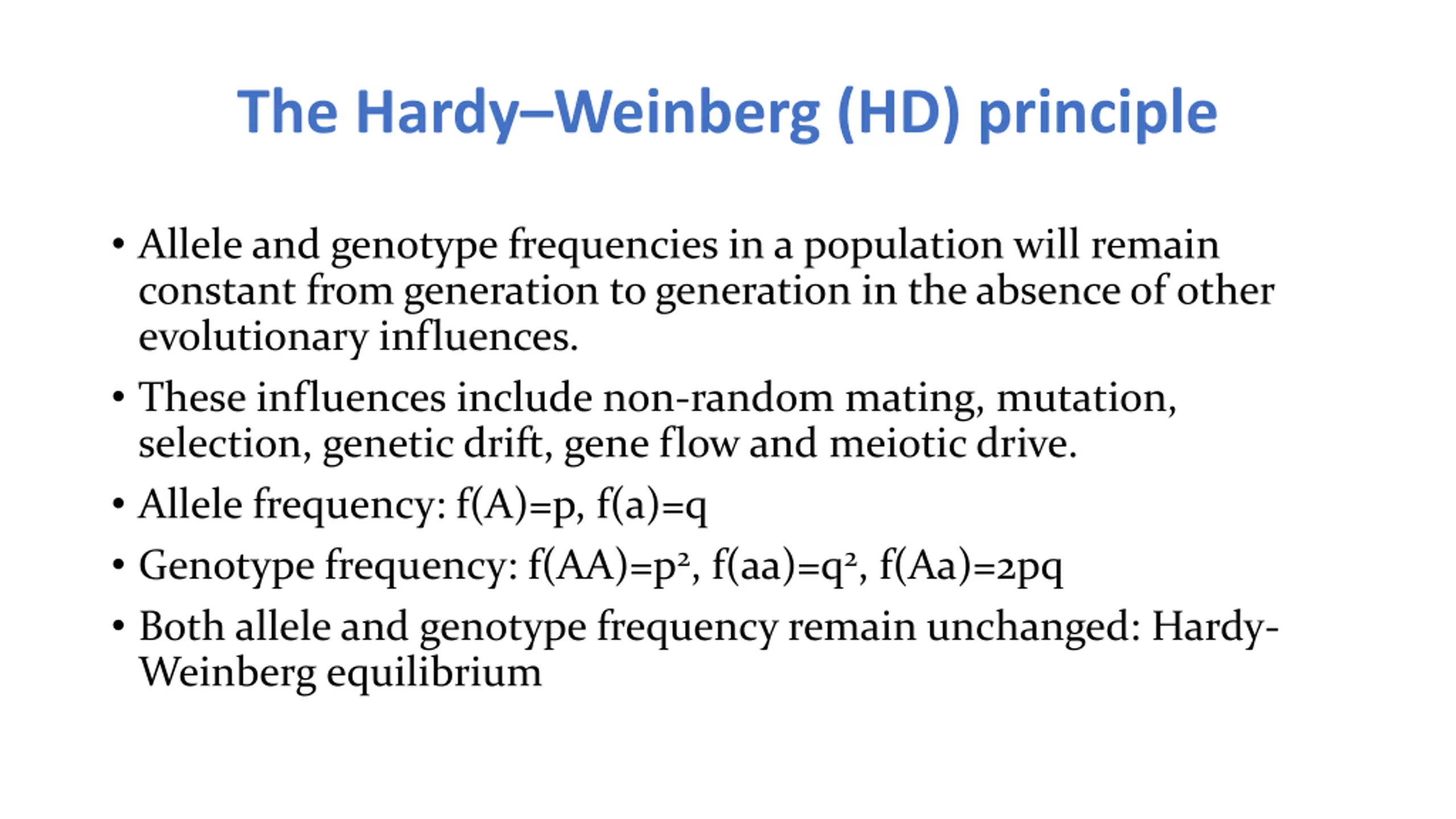 The HardyWeinberg (HD) principle Allele and genotype frequencies in a population will remain constant from generation to generation in the absence of other evolutionary influences. These influences include non-random mating, mutation, selection, genetic drift, gene flow and meiotic drive. Allele frequency: f(A)=p, f(a)=q Genotype frequency: f(AA)=p2, f(aa)=q2, f(Aa)=2pq Both allele and genotype frequency remain unchanged: Hardy- Weinberg equilibrium