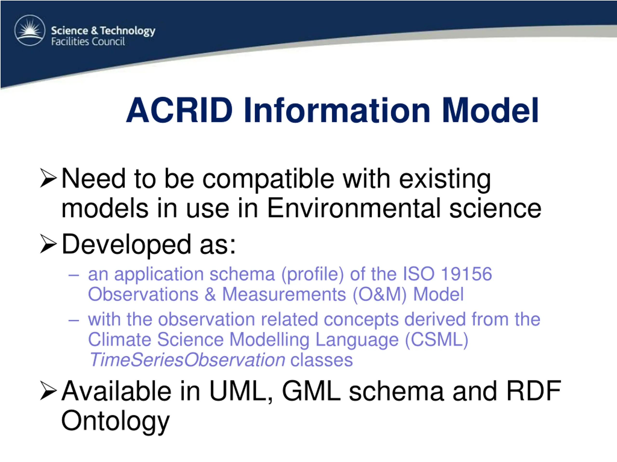 ACRID Information Model Need to be compatible with existing models in use in Environmental science Developed as: an application schema (profile) of the ISO 19156 Observations & Measurements (O&M) Model with the observation related concepts derived from the Climate Science Modelling Language (CSML) TimeSeriesObservation classes Available in UML, GML schema and RDF Ontology