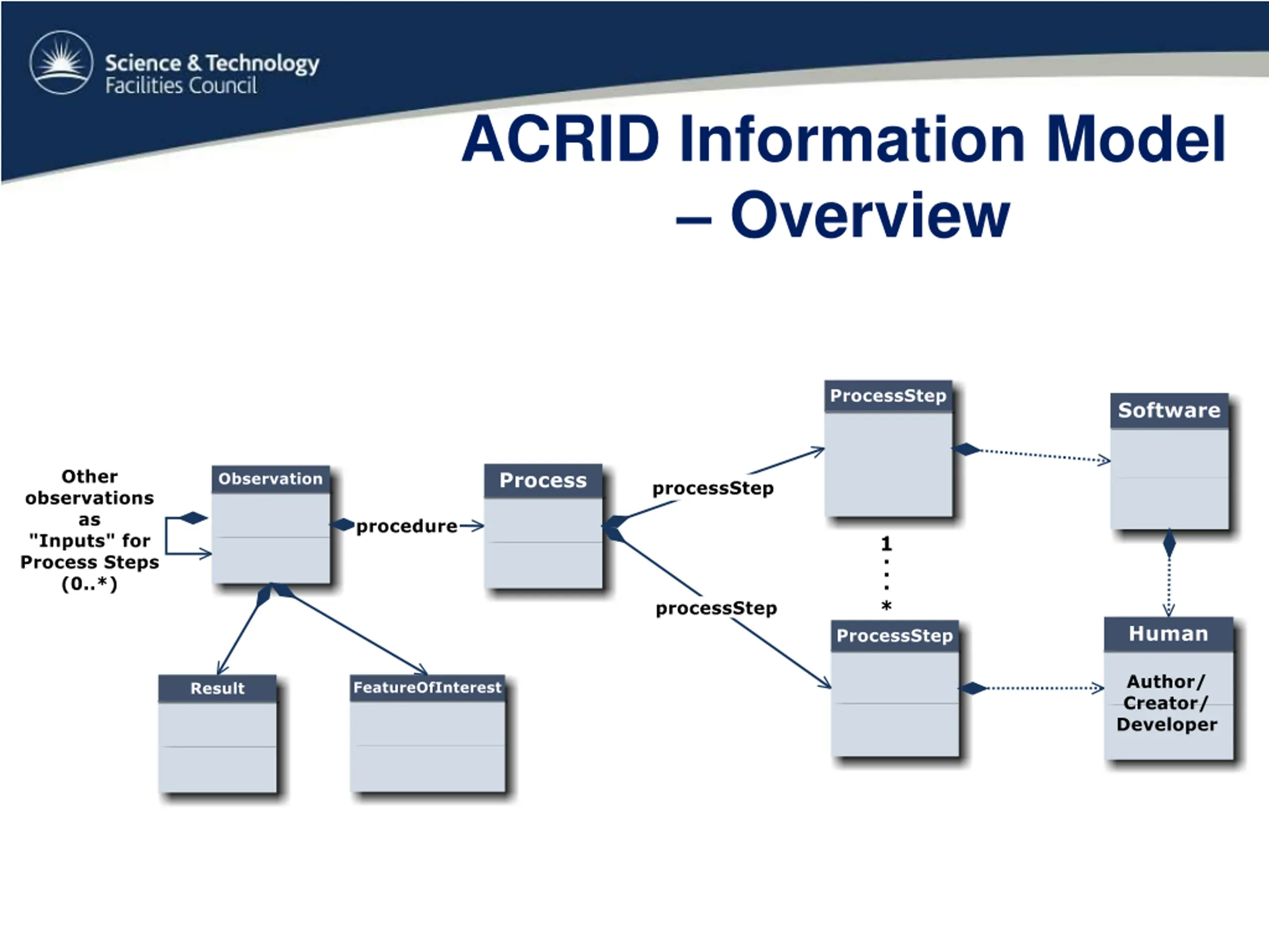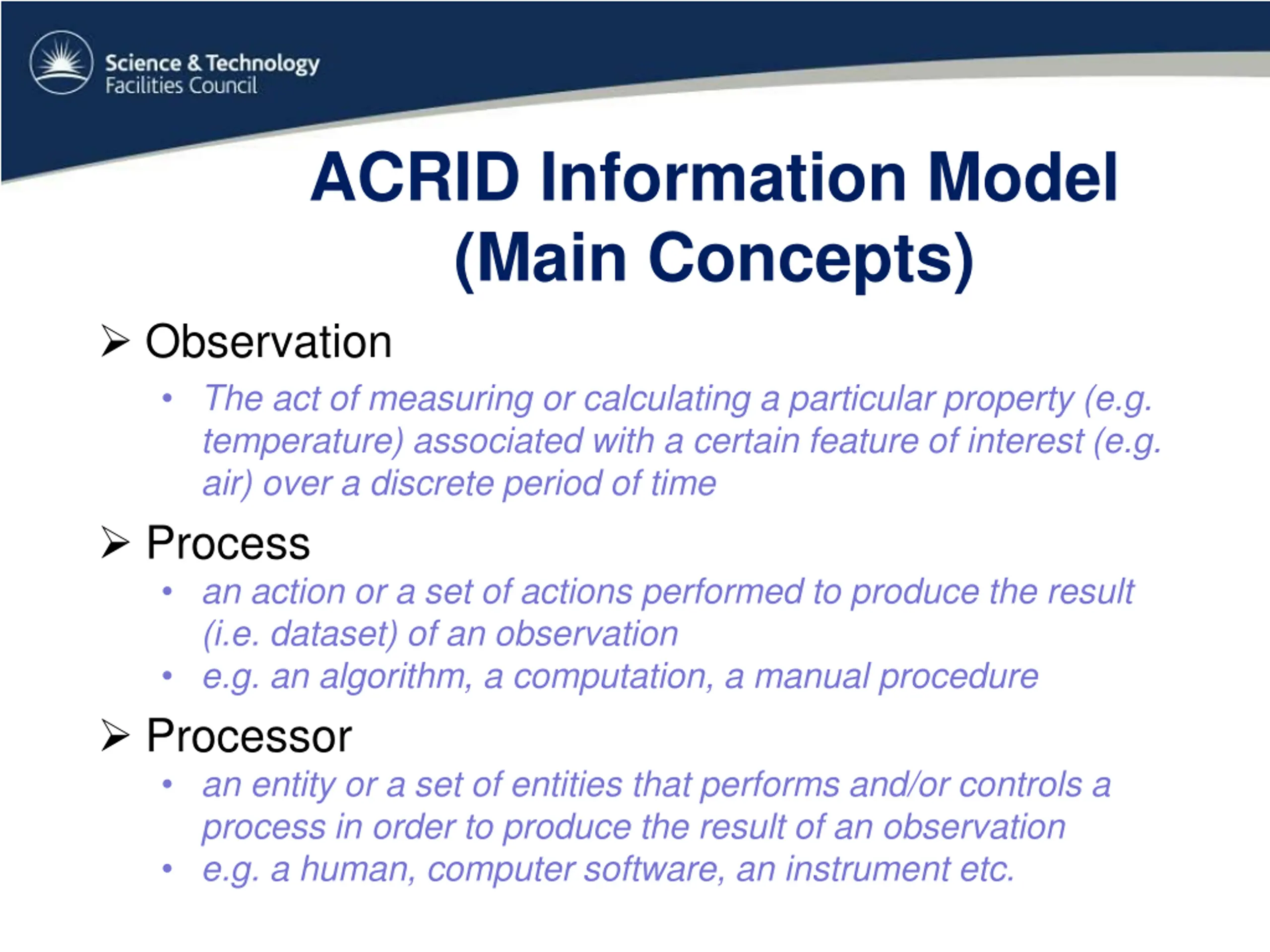 ACRID Information Model (Main Concepts) Observation The act of measuring or calculating a particular property (e.g. temperature) associated with a certain feature of interest (e.g. air) over a discrete period of time Process an action or a set of actions performed to produce the result (i.e. dataset) of an observation e.g. an algorithm, a computation, a manual procedure Processor an entity or a set of entities that performs and/or controls a process in order to produce the result of an observation e.g. a human, computer software, an instrument etc.