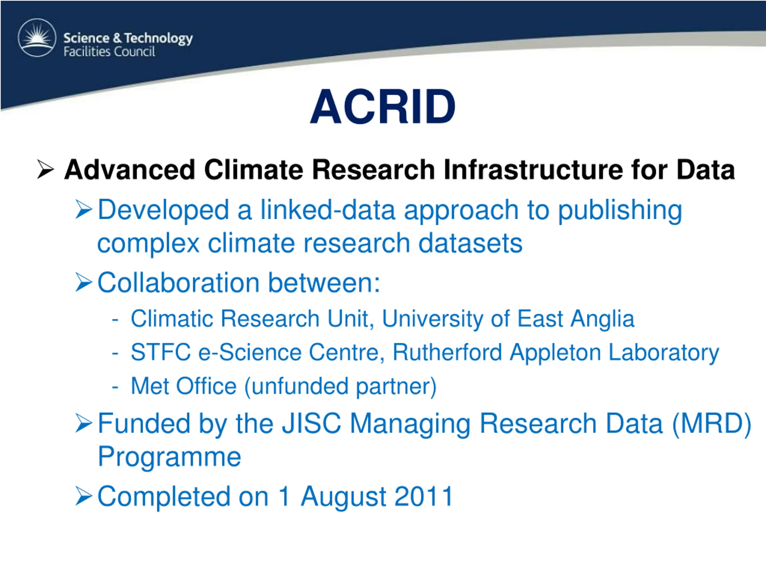 ACRID Advanced Climate Research Infrastructure for Data Developed a linked-data approach to publishing complex climate research datasets Collaboration between: - Climatic Research Unit, University of East Anglia - STFC e-Science Centre, Rutherford Appleton Laboratory - Met Office (unfunded partner) Funded by the JISC Managing Research Data (MRD) Programme Completed on 1 August 2011