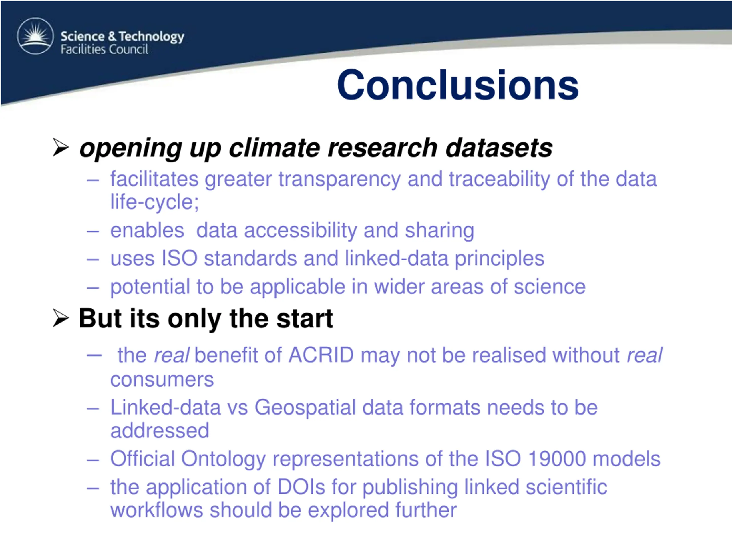 Conclusions opening up climate research datasets facilitates greater transparency and traceability of the data life-cycle; enables data accessibility and sharing uses ISO standards and linked-data principles potential to be applicable in wider areas of science But its only the start the real benefit of ACRID may not be realised without real consumers Linked-data vs Geospatial data formats needs to be addressed Official Ontology representations of the ISO 19000 models the application of DOIs for publishing linked scientific workflows should be explored further