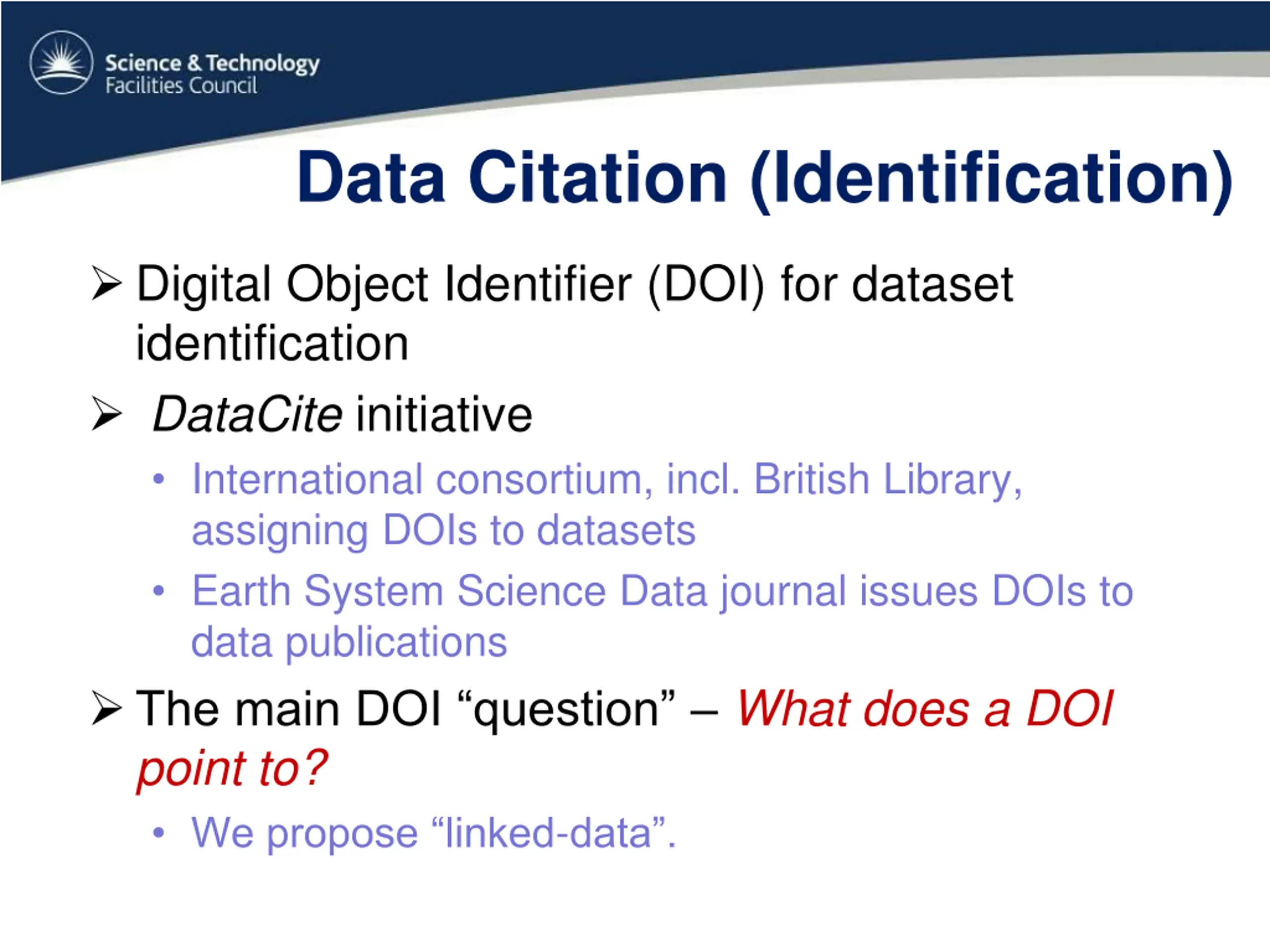 Data Citation (Identification) Digital Object Identifier (DOI) for dataset identification DataCite initiative International consortium, incl. British Library, assigning DOIs to datasets Earth System Science Data journal issues DOIs to data publications The main DOI question What does a DOI point to? We propose linked-data .