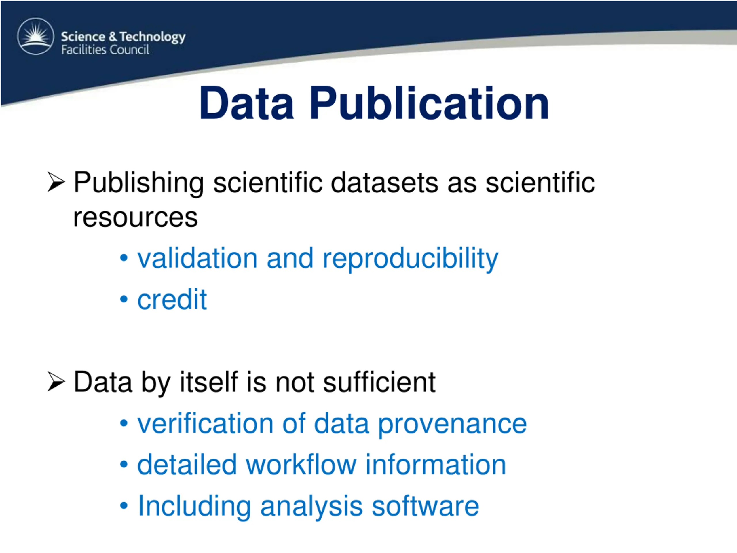 Data Publication Publishing scientific datasets as scientific resources validation and reproducibility credit Data by itself is not sufficient verification of data provenance detailed workflow information Including analysis software