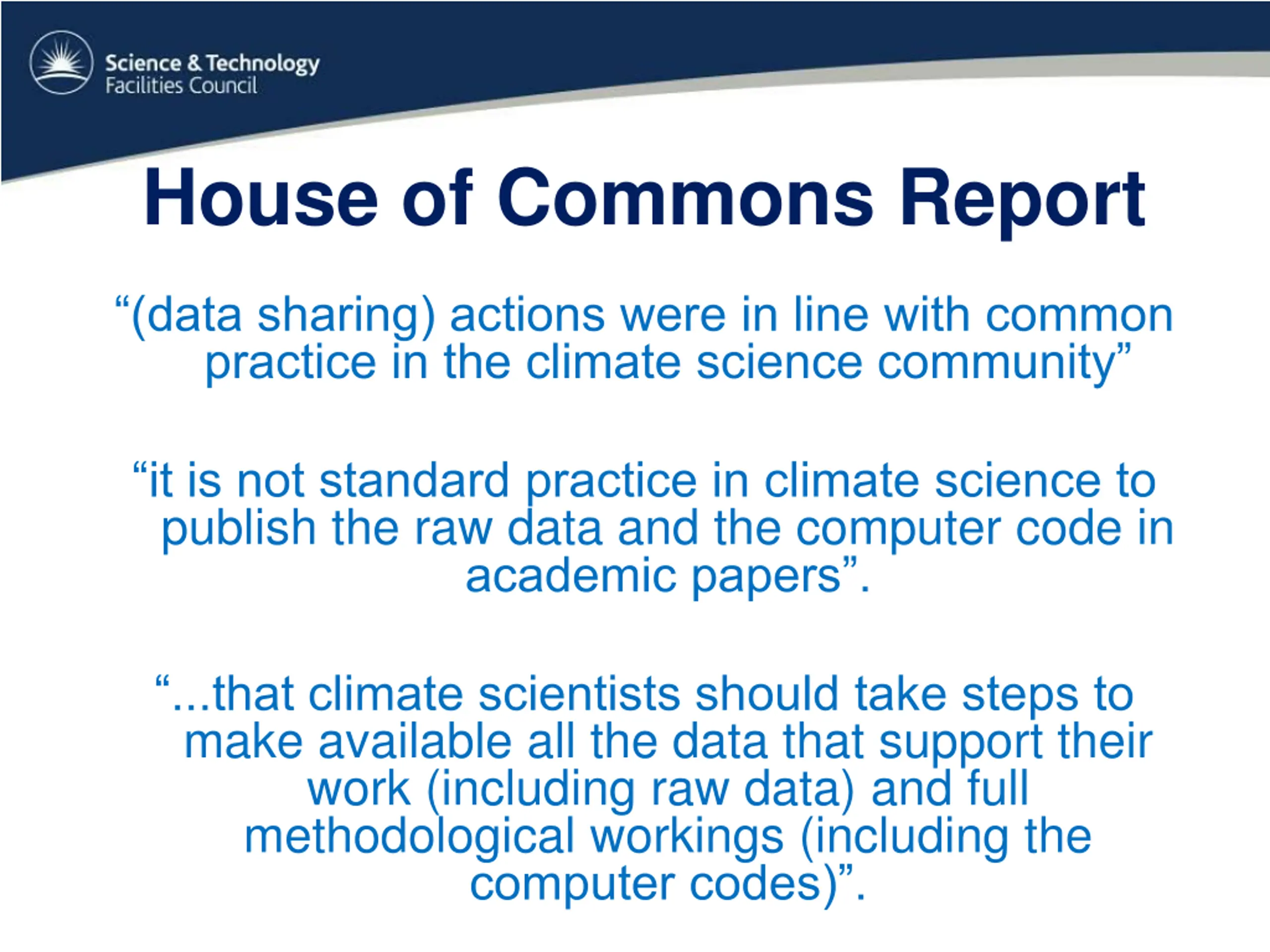 House of Commons Report (data sharing) actions were in line with common practice in the climate science community it is not standard practice in climate science to publish the raw data and the computer code in academic papers . ...that climate scientists should take steps to make available all the data that support their work (including raw data) and full methodological workings (including the computer codes) .