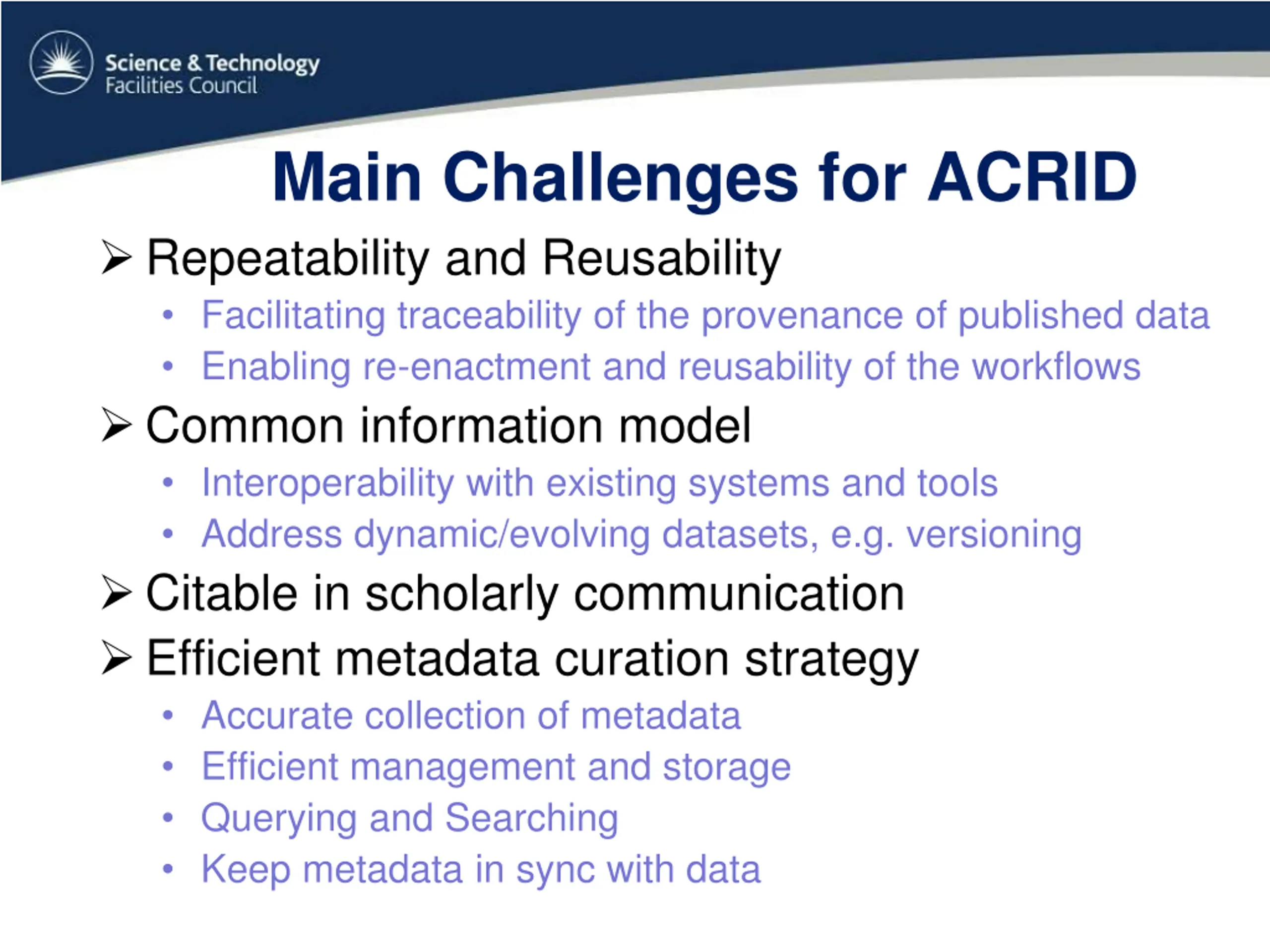 Main Challenges for ACRID Repeatability and Reusability Facilitating traceability of the provenance of published data Enabling re-enactment and reusability of the workflows Common information model Interoperability with existing systems and tools Address dynamic/evolving datasets, e.g. versioning Citable in scholarly communication Efficient metadata curation strategy Accurate collection of metadata Efficient management and storage Querying and Searching Keep metadata in sync with data