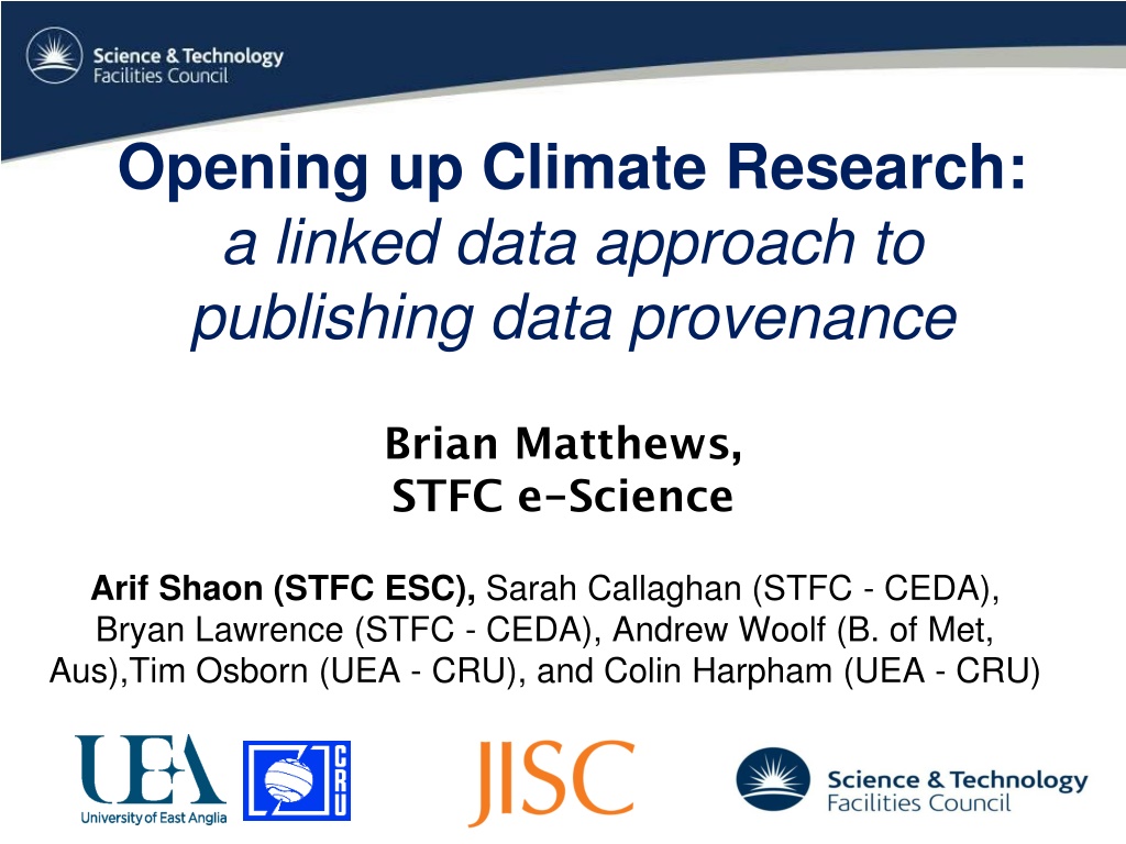 Opening up Climate Research: a linked data approach to publishing data provenance Brian Matthews, STFC e-Science Arif Shaon (STFC ESC), Sarah Callaghan (STFC - CEDA), Bryan Lawrence (STFC - CEDA), Andrew Woolf (B. of Met, Aus),Tim Osborn (UEA - CRU), and Colin Harpham (UEA - CRU)