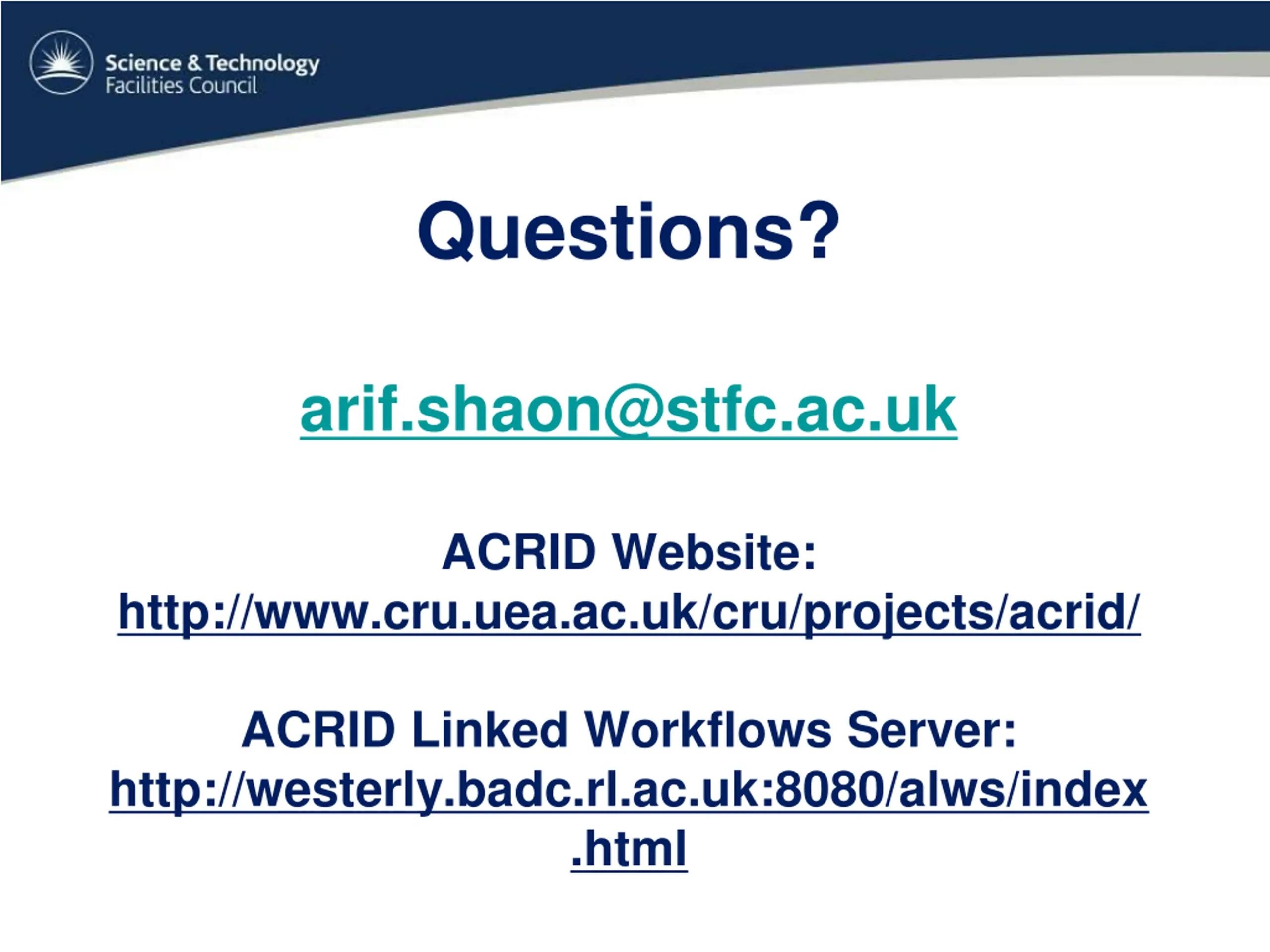 Questions? arif.shaon@stfc.ac.uk ACRID Website: http://www.cru.uea.ac.uk/cru/projects/acrid/ ACRID Linked Workflows Server: http://westerly.badc.rl.ac.uk:8080/alws/index .html