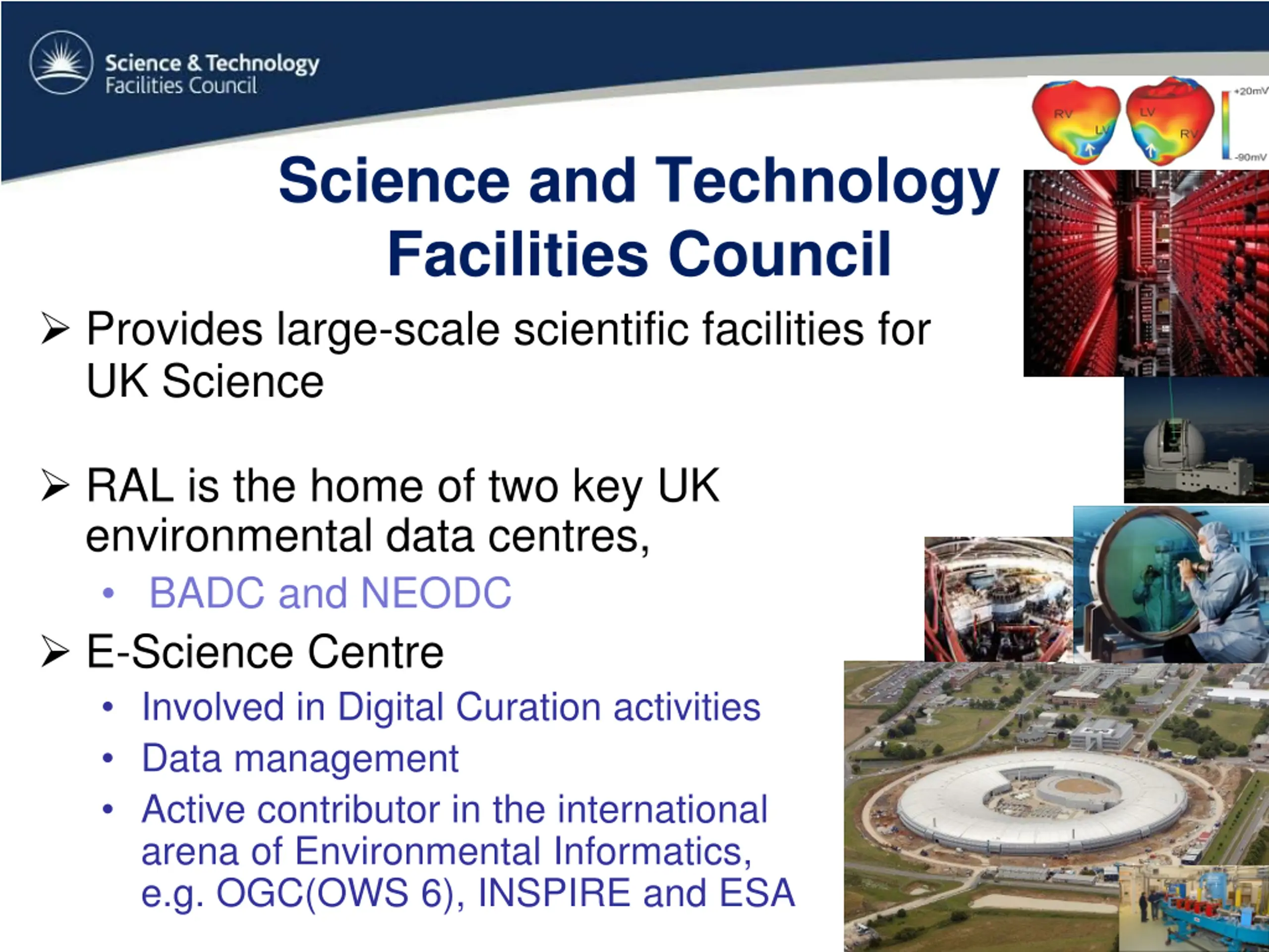 Science and Technology Facilities Council Provides large-scale scientific facilities for UK Science RAL is the home of two key UK environmental data centres, BADC and NEODC E-Science Centre Involved in Digital Curation activities Data management Active contributor in the international arena of Environmental Informatics, e.g. OGC(OWS 6), INSPIRE and ESA