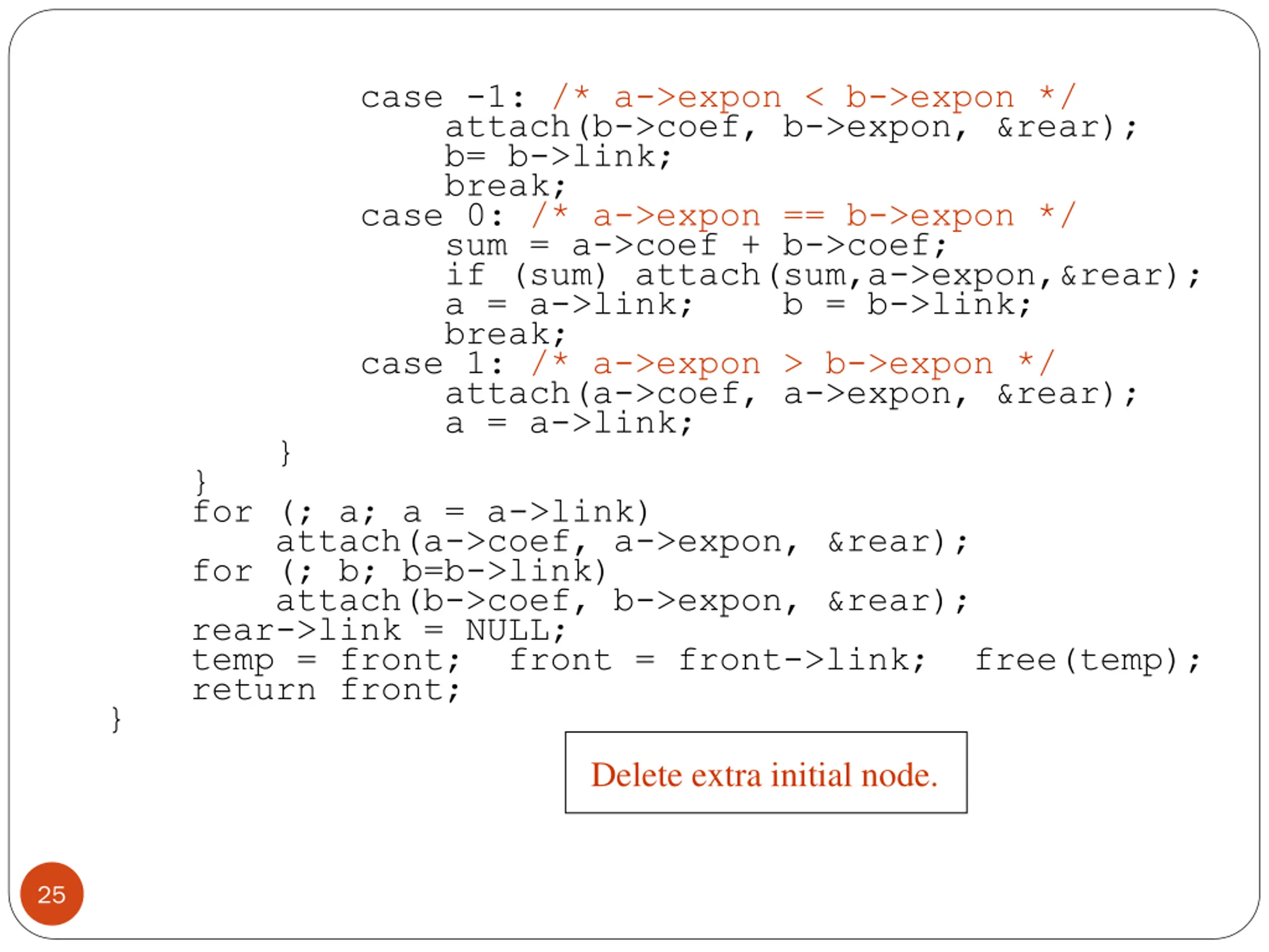 case -1: /* a->expon < b->expon */ attach(b->coef, b->expon, &rear); b= b->link; break; case 0: /* a->expon == b->expon */ sum = a->coef + b->coef; if (sum) attach(sum,a->expon,&rear); a = a->link; b = b->link; break; case 1: /* a->expon > b->expon */ attach(a->coef, a->expon, &rear); a = a->link; } } for (; a; a = a->link) attach(a->coef, a->expon, &rear); for (; b; b=b->link) attach(b->coef, b->expon, &rear); rear->link = NULL; temp = front; front = front->link; free(temp); return front; } Delete extra initial node. 25