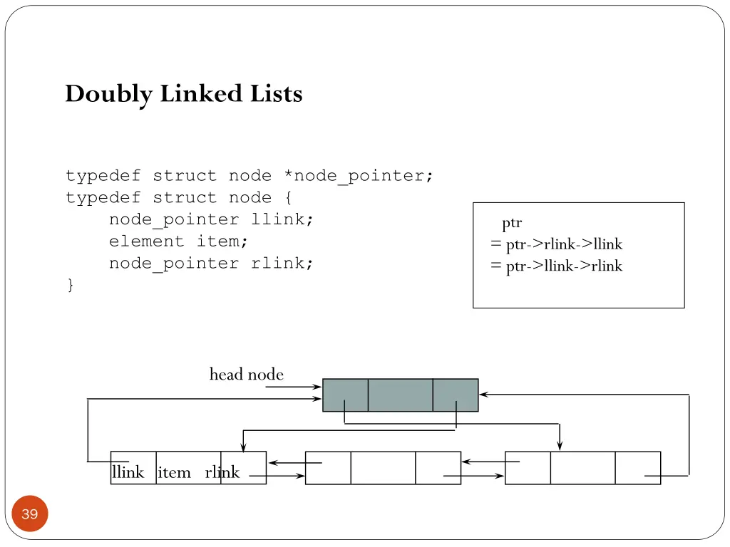 Doubly Linked List Move in forward and backward direction. Singly linked list (in one direction only) How to get the preceding node during deletion or insertion? Using 2 pointers Node in doubly linked list left link field (llink) data field (item) right link field (rlink) 38