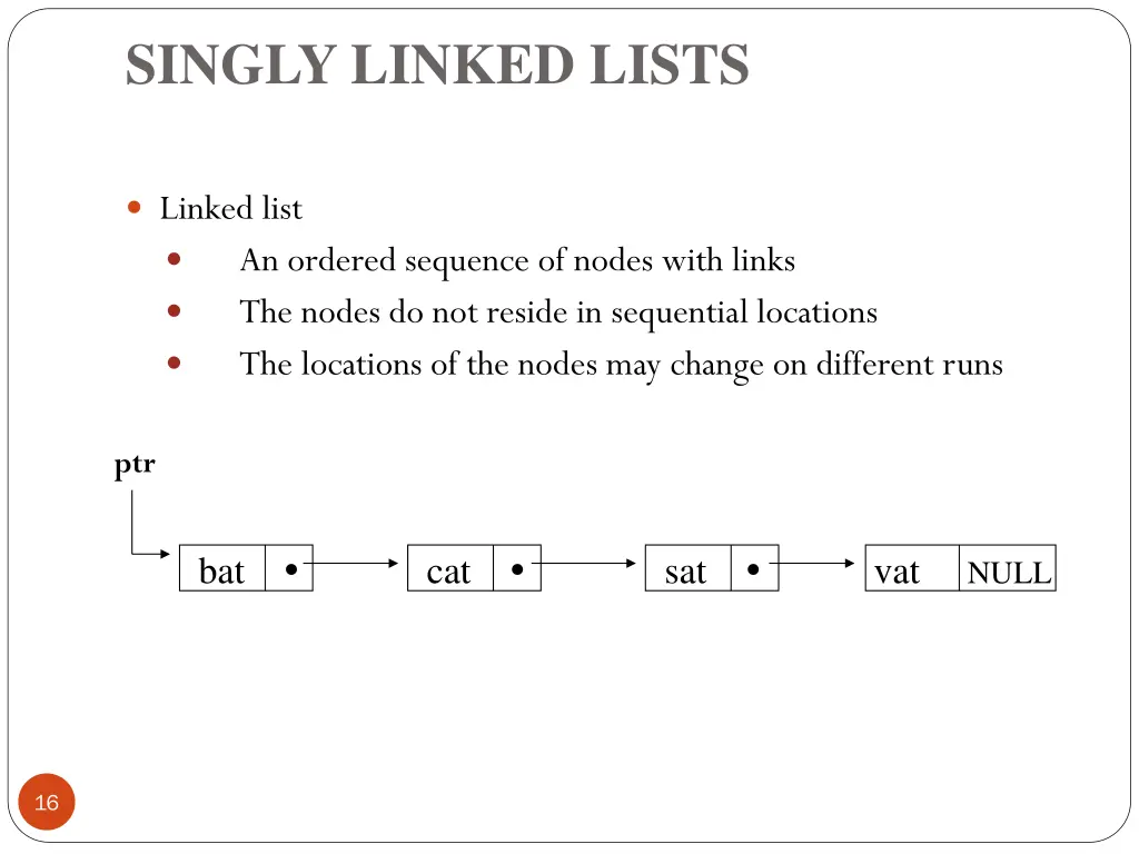 SINGLY LINKED LISTS Linked list An ordered sequence of nodes with links The nodes do not reside in sequential locations The locations of the nodes may change on different runs ptr bat cat sat vat NULL 16
