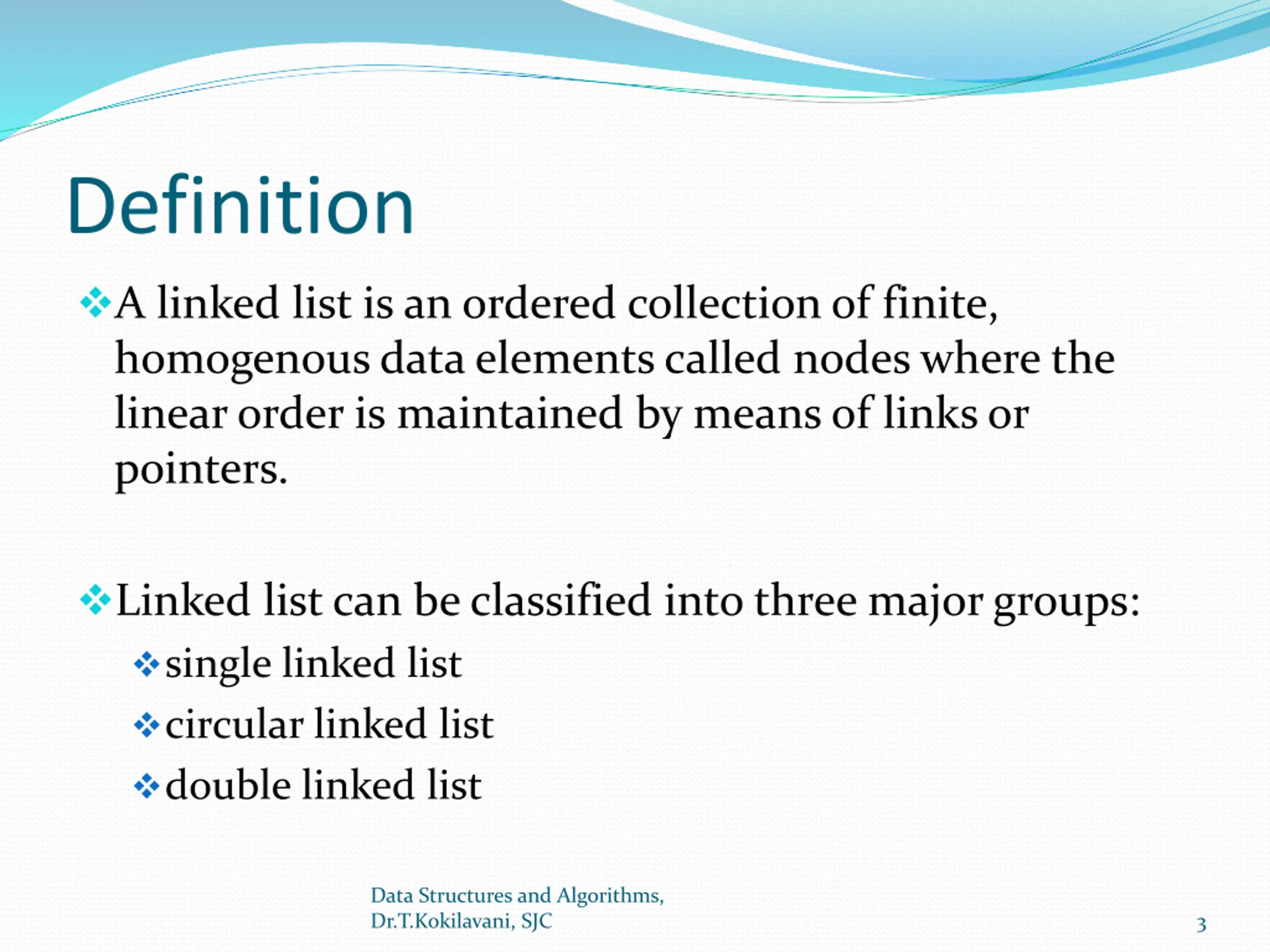 Definition A linked list is an ordered collection of finite, homogenous data elements called nodes where the linear order is maintained by means of links or pointers. Linked list can be classified into three major groups: single linked list circular linked list double linked list Data Structures and Algorithms, Dr.T.Kokilavani, SJC 3