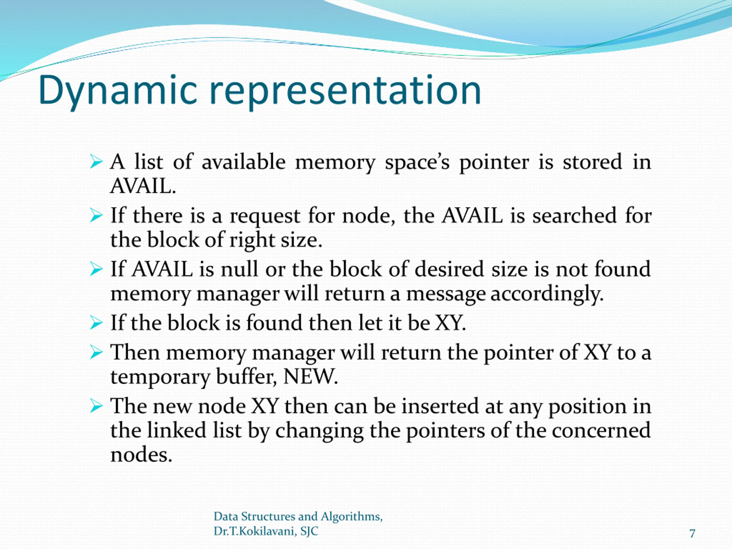 Dynamic representation A list of available memory space s pointer is stored in AVAIL. If there is a request for node, the AVAIL is searched for the block of right size. If AVAIL is null or the block of desired size is not found memory manager will return a message accordingly. If the block is found then let it be XY. Then memory manager will return the pointer of XY to a temporary buffer, NEW. The new node XY then can be inserted at any position in the linked list by changing the pointers of the concerned nodes. Data Structures and Algorithms, Dr.T.Kokilavani, SJC 7