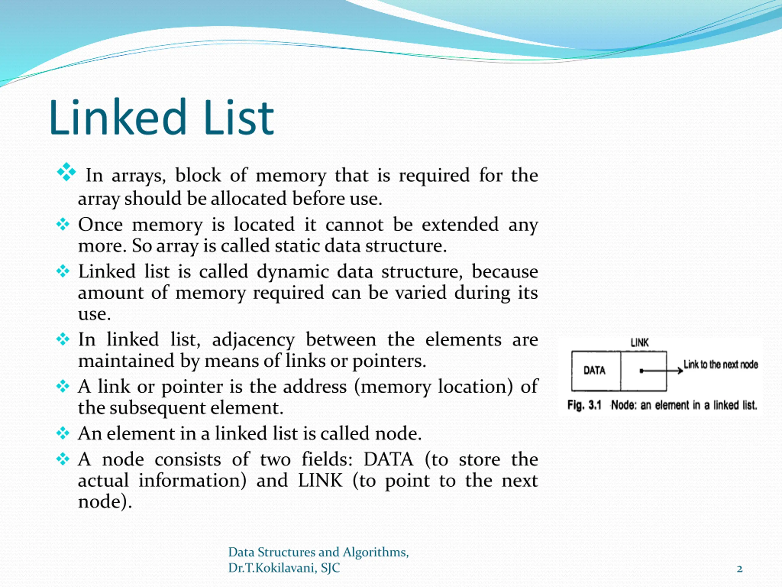 Linked List In arrays, block of memory that is required for the array should be allocated before use. Once memory is located it cannot be extended any more. So array is called static data structure. Linked list is called dynamic data structure, because amount of memory required can be varied during its use. In linked list, adjacency between the elements are maintained by means of links or pointers. A link or pointer is the address (memory location) of the subsequent element. An element in a linked list is called node. A node consists of two fields: DATA (to store the actual information) and LINK (to point to the next node). Data Structures and Algorithms, Dr.T.Kokilavani, SJC 2