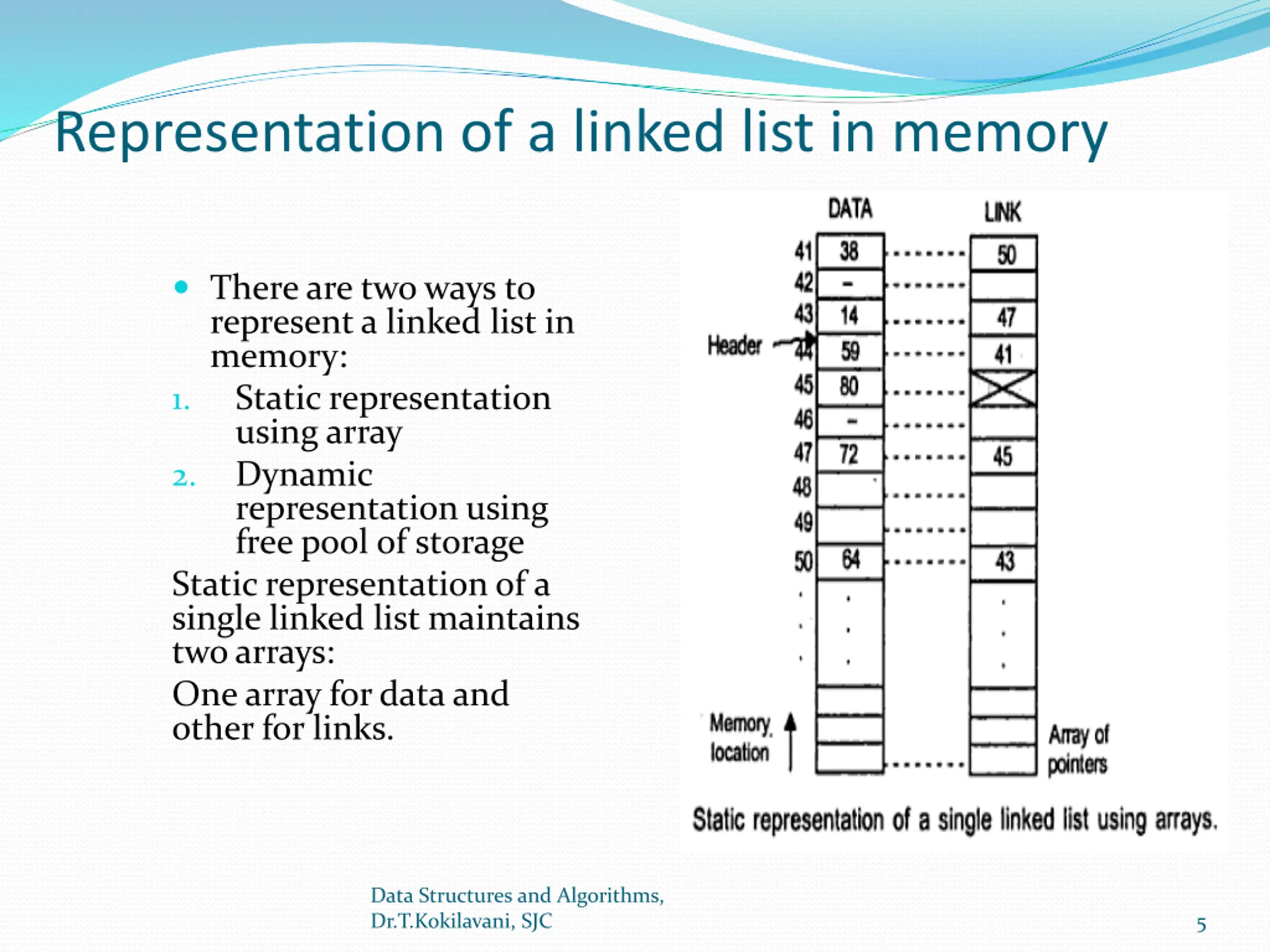 Representation of a linked list in memory There are two ways to represent a linked list in memory: 1. Static representation using array 2. Dynamic representation using free pool of storage Static representation of a single linked list maintains two arrays: One array for data and other for links. Data Structures and Algorithms, Dr.T.Kokilavani, SJC 5