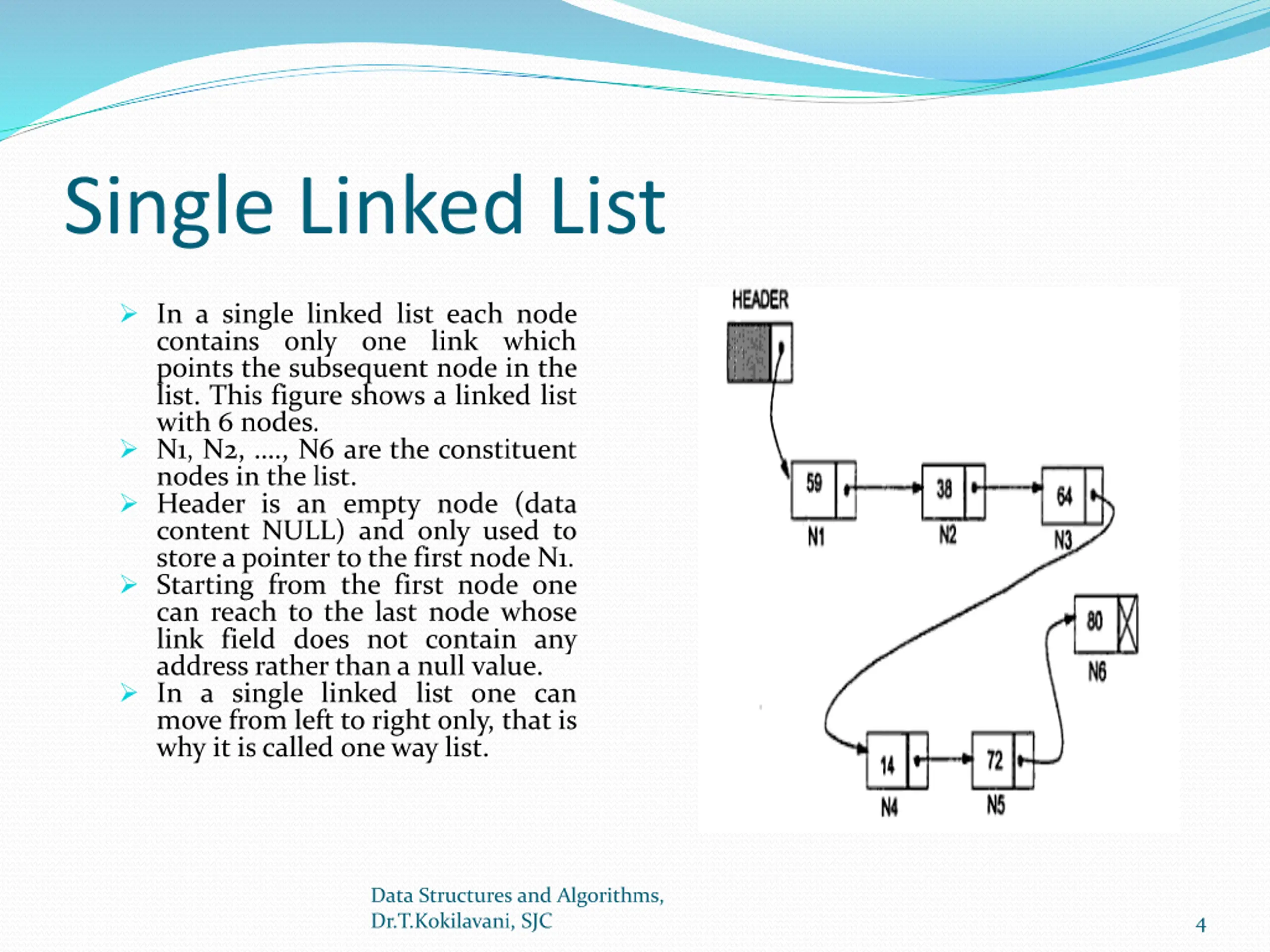 Single Linked List In a single linked list each node contains only one link which points the subsequent node in the list. This figure shows a linked list with 6 nodes. N1, N2, ., N6 are the constituent nodes in the list. Header is an empty node (data content NULL) and only used to store a pointer to the first node N1. Starting from the first node one can reach to the last node whose link field does not contain any address rather than a null value. In a single linked list one can move from left to right only, that is why it is called one way list. Data Structures and Algorithms, Dr.T.Kokilavani, SJC 4