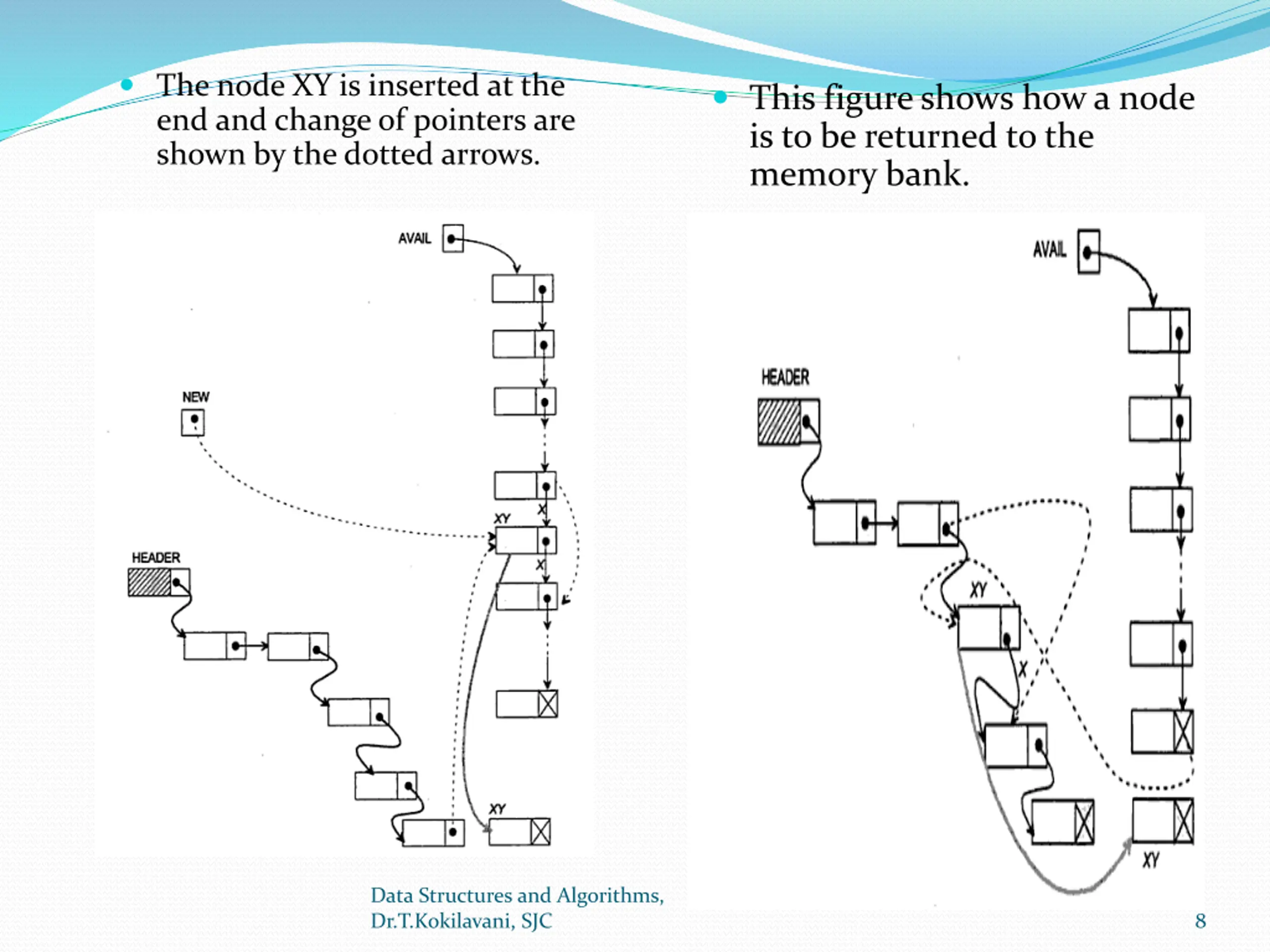 The node XY is inserted at the end and change of pointers are shown by the dotted arrows. This figure shows how a node is to be returned to the memory bank. Data Structures and Algorithms, Dr.T.Kokilavani, SJC 8