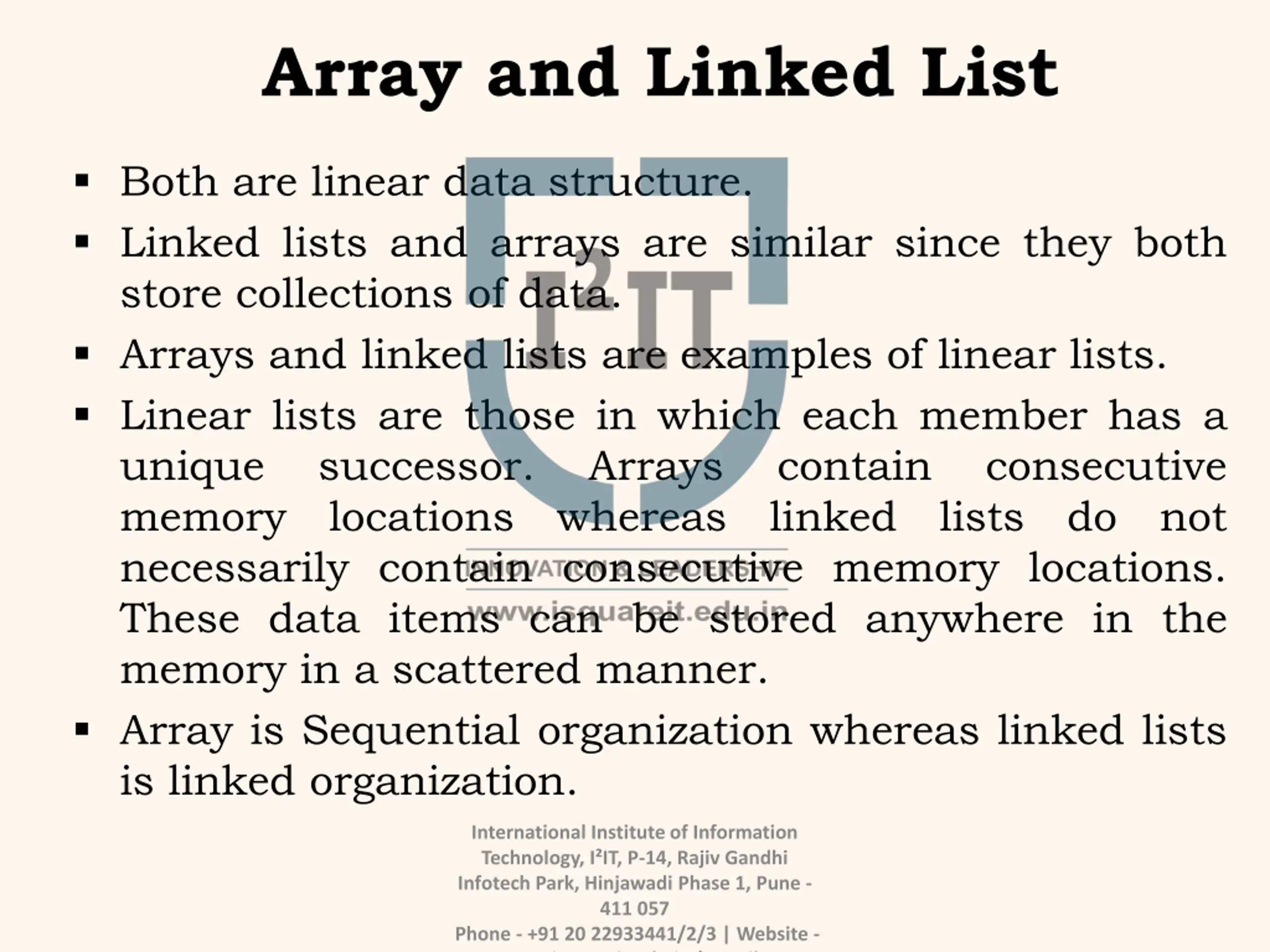 Array and Linked List Both are linear data structure. Linked lists and arrays are similar since they both store collections of data. Arrays and linked lists are examples of linear lists. Linear lists are those in which each member has a unique successor. Arrays memory locations whereas linked lists do not necessarily contain consecutive memory locations. These data items can be stored anywhere in the memory in a scattered manner. Array is Sequential organization whereas linked lists is linked organization. contain consecutive International Institute of Information Technology, I IT, P-14, Rajiv Gandhi Infotech Park, Hinjawadi Phase 1, Pune - 411 057 Phone - +91 20 22933441/2/3 | Website - www.isquareit.edu.in | Email -