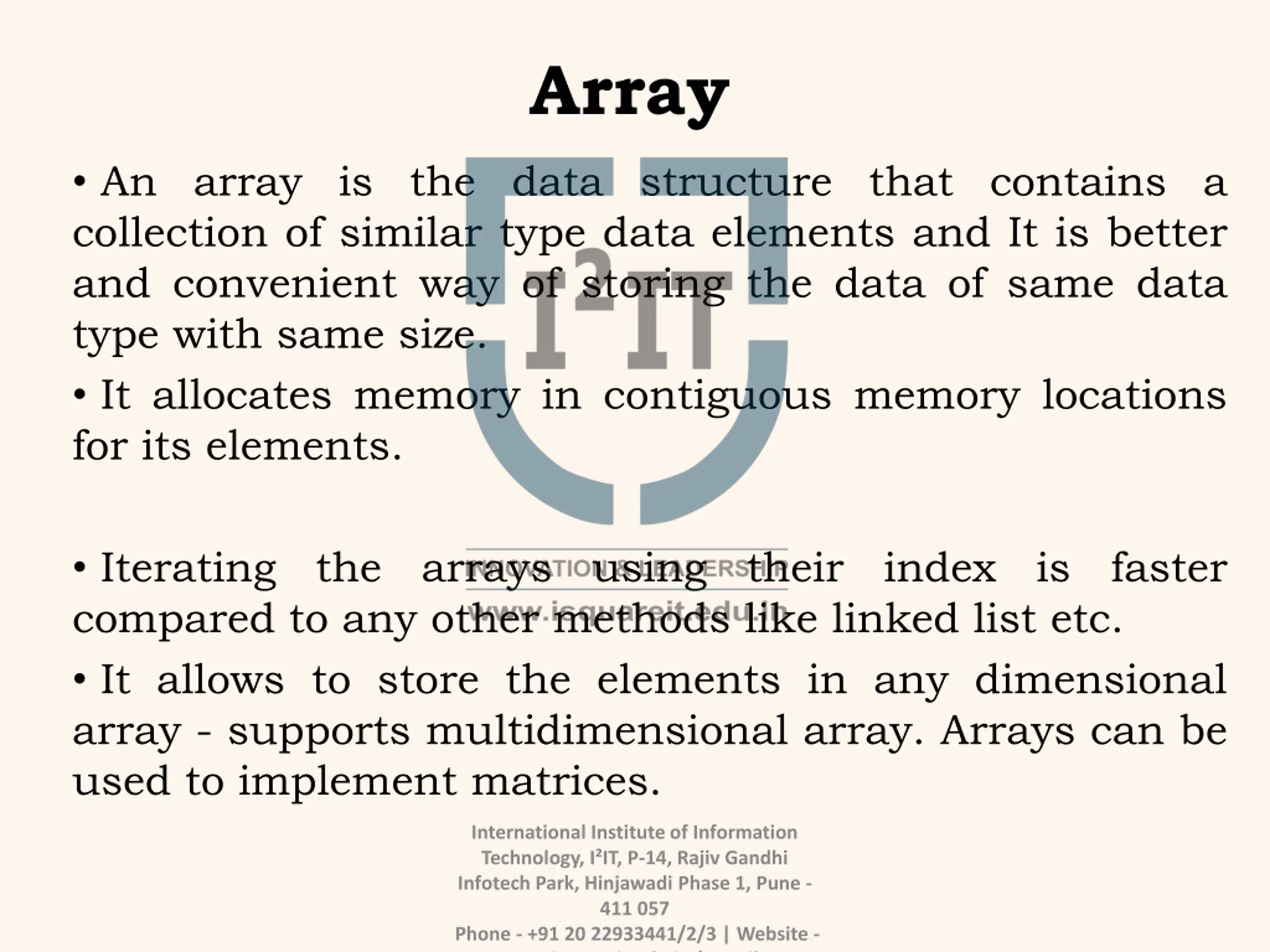 Array An array is the data structure that contains a collection of similar type data elements and It is better and convenient way of storing the data of same data type with same size. It allocates memory in contiguous memory locations for its elements. Iterating the arrays using their index is faster compared to any other methods like linked list etc. It allows to store the elements in any dimensional array - supports multidimensional array. Arrays can be used to implement matrices. International Institute of Information Technology, I IT, P-14, Rajiv Gandhi Infotech Park, Hinjawadi Phase 1, Pune - 411 057 Phone - +91 20 22933441/2/3 | Website - www.isquareit.edu.in | Email -