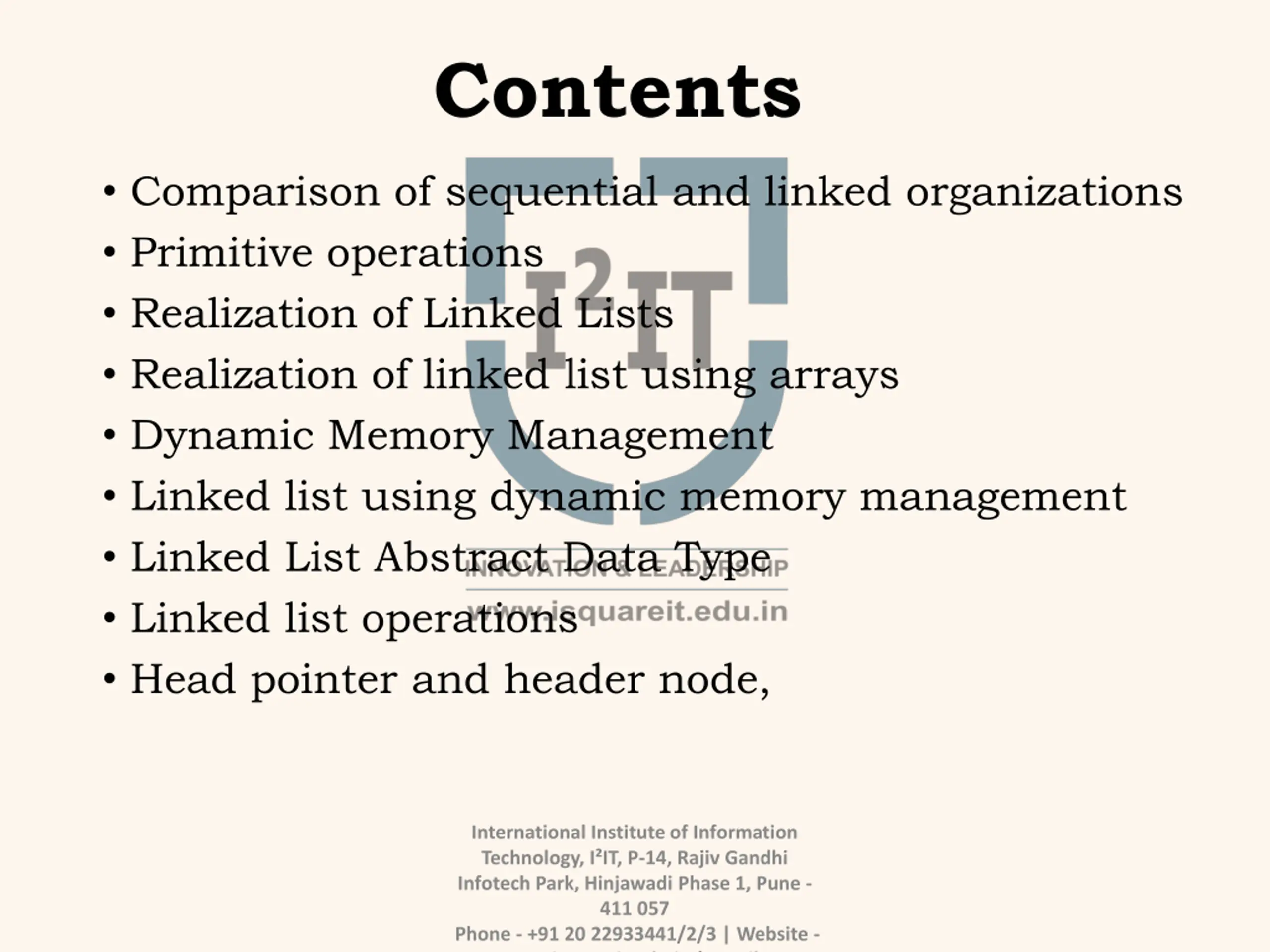 Contents Comparison of sequential and linked organizations Primitive operations Realization of Linked Lists Realization of linked list using arrays Dynamic Memory Management Linked list using dynamic memory management Linked List Abstract Data Type Linked list operations Head pointer and header node, International Institute of Information Technology, I IT, P-14, Rajiv Gandhi Infotech Park, Hinjawadi Phase 1, Pune - 411 057 Phone - +91 20 22933441/2/3 | Website - www.isquareit.edu.in | Email -