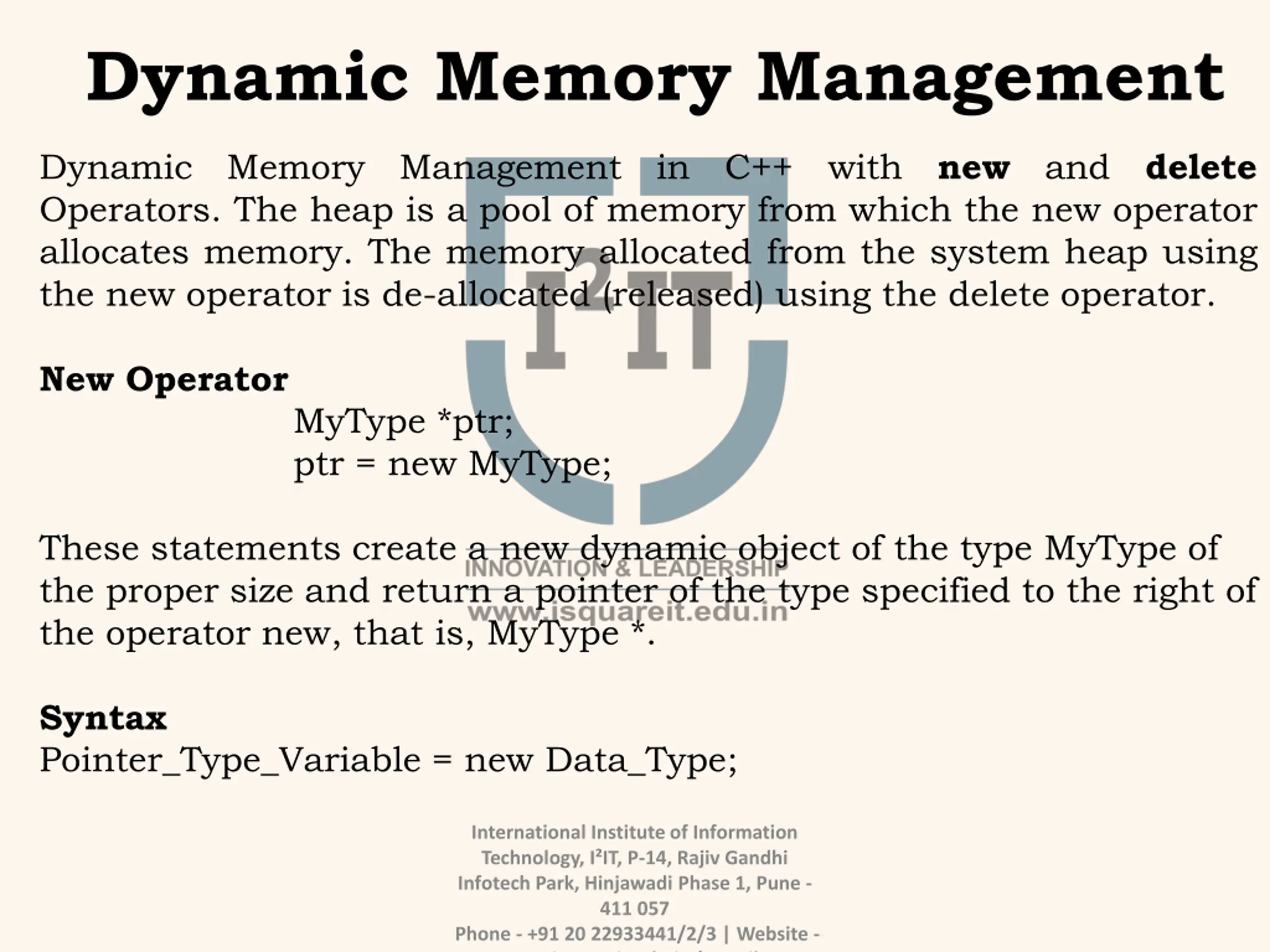 Dynamic Memory Management Dynamic Memory Management in C++ with new and delete Operators. The heap is a pool of memory from which the new operator allocates memory. The memory allocated from the system heap using the new operator is de-allocated (released) using the delete operator. New Operator MyType *ptr; ptr = new MyType; These statements create a new dynamic object of the type MyType of the proper size and return a pointer of the type specified to the right of the operator new, that is, MyType *. Syntax Pointer_Type_Variable = new Data_Type; International Institute of Information Technology, I IT, P-14, Rajiv Gandhi Infotech Park, Hinjawadi Phase 1, Pune - 411 057 Phone - +91 20 22933441/2/3 | Website - www.isquareit.edu.in | Email -