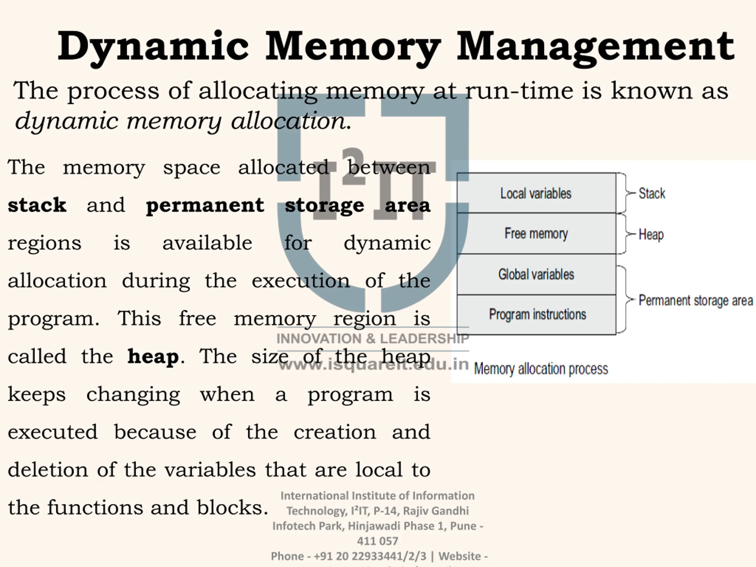Dynamic Memory Management The process of allocating memory at run-time is known as dynamic memory allocation. The memory space allocated between stack and permanent storage area regions is available for dynamic allocation during the execution of the program. This free memory region is called the heap. The size of the heap keeps changing when a program is executed because of the creation and deletion of the variables that are local to International Institute of Information Technology, I IT, P-14, Rajiv Gandhi Infotech Park, Hinjawadi Phase 1, Pune - 411 057 Phone - +91 20 22933441/2/3 | Website - www.isquareit.edu.in | Email - the functions and blocks.