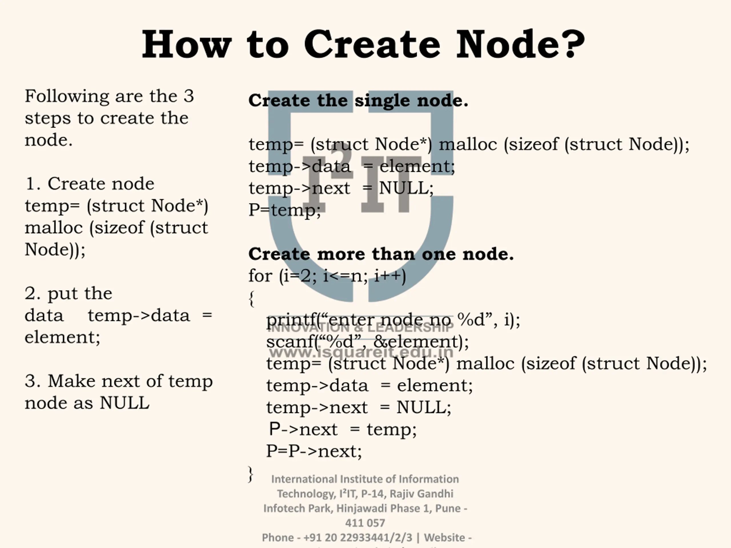 How to Create Node? Following are the 3 steps to create the node. Create the single node. temp= (struct Node*) malloc (sizeof (struct Node)); temp->data = element; temp->next = NULL; P=temp; 1. Create node temp= (struct Node*) malloc (sizeof (struct Node)); Create more than one node. for (i=2; i<=n; i++) { printf( enter node no %d , i); scanf( %d , &element); temp= (struct Node*) malloc (sizeof (struct Node)); temp->data = element; temp->next = NULL; P->next = temp; P=P->next; } 2. put the data element; temp->data = 3. Make next of temp node as NULL International Institute of Information Technology, I IT, P-14, Rajiv Gandhi Infotech Park, Hinjawadi Phase 1, Pune - 411 057 Phone - +91 20 22933441/2/3 | Website - www.isquareit.edu.in | Email -