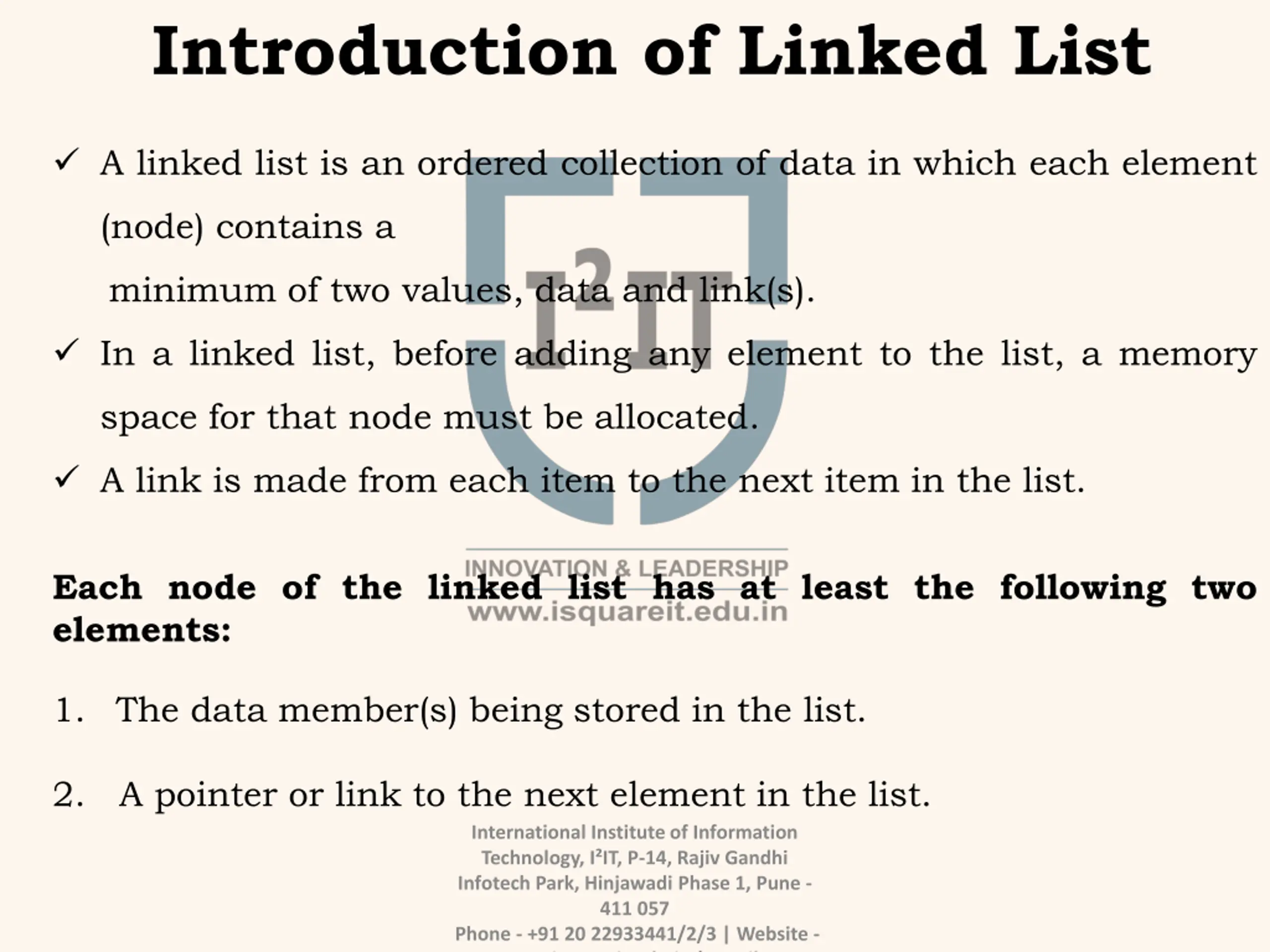 Introduction of Linked List A linked list is an ordered collection of data in which each element (node) contains a minimum of two values, data and link(s). In a linked list, before adding any element to the list, a memory space for that node must be allocated. A link is made from each item to the next item in the list. Each node of the linked list has at least the following two elements: 1. The data member(s) being stored in the list. 2. A pointer or link to the next element in the list. International Institute of Information Technology, I IT, P-14, Rajiv Gandhi Infotech Park, Hinjawadi Phase 1, Pune - 411 057 Phone - +91 20 22933441/2/3 | Website - www.isquareit.edu.in | Email -
