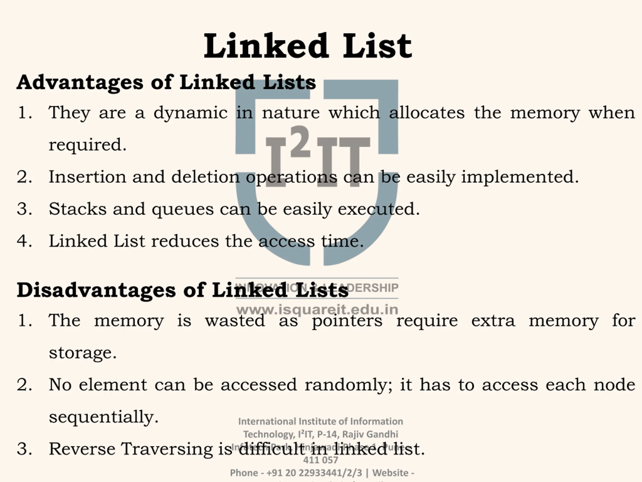 Linked List Advantages of Linked Lists 1. They are a dynamic in nature which allocates the memory when required. 2. Insertion and deletion operations can be easily implemented. 3. Stacks and queues can be easily executed. 4. Linked List reduces the access time. Disadvantages of Linked Lists 1. The memory is wasted as pointers require extra memory for storage. 2. No element can be accessed randomly; it has to access each node sequentially. International Institute of Information Technology, I IT, P-14, Rajiv Gandhi Infotech Park, Hinjawadi Phase 1, Pune - 411 057 Phone - +91 20 22933441/2/3 | Website - www.isquareit.edu.in | Email - 3. Reverse Traversing is difficult in linked list.