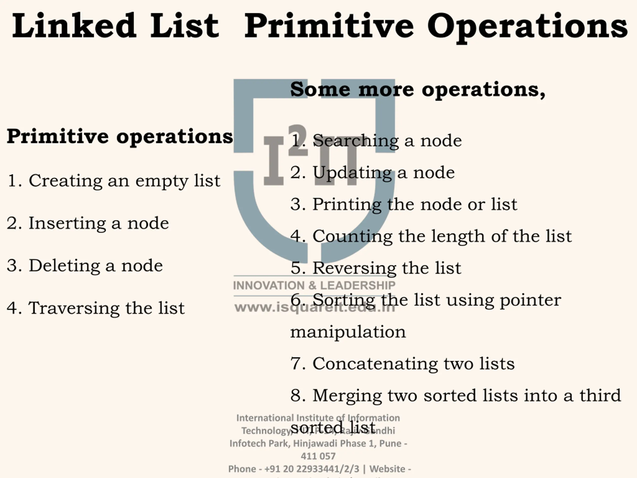 Linked List Primitive Operations Some more operations, Primitive operations 1. Searching a node 2. Updating a node 1. Creating an empty list 3. Printing the node or list 2. Inserting a node 4. Counting the length of the list 3. Deleting a node 5. Reversing the list 6. Sorting the list using pointer 4. Traversing the list manipulation 7. Concatenating two lists 8. Merging two sorted lists into a third International Institute of Information Technology, I IT, P-14, Rajiv Gandhi Infotech Park, Hinjawadi Phase 1, Pune - 411 057 Phone - +91 20 22933441/2/3 | Website - www.isquareit.edu.in | Email - sorted list