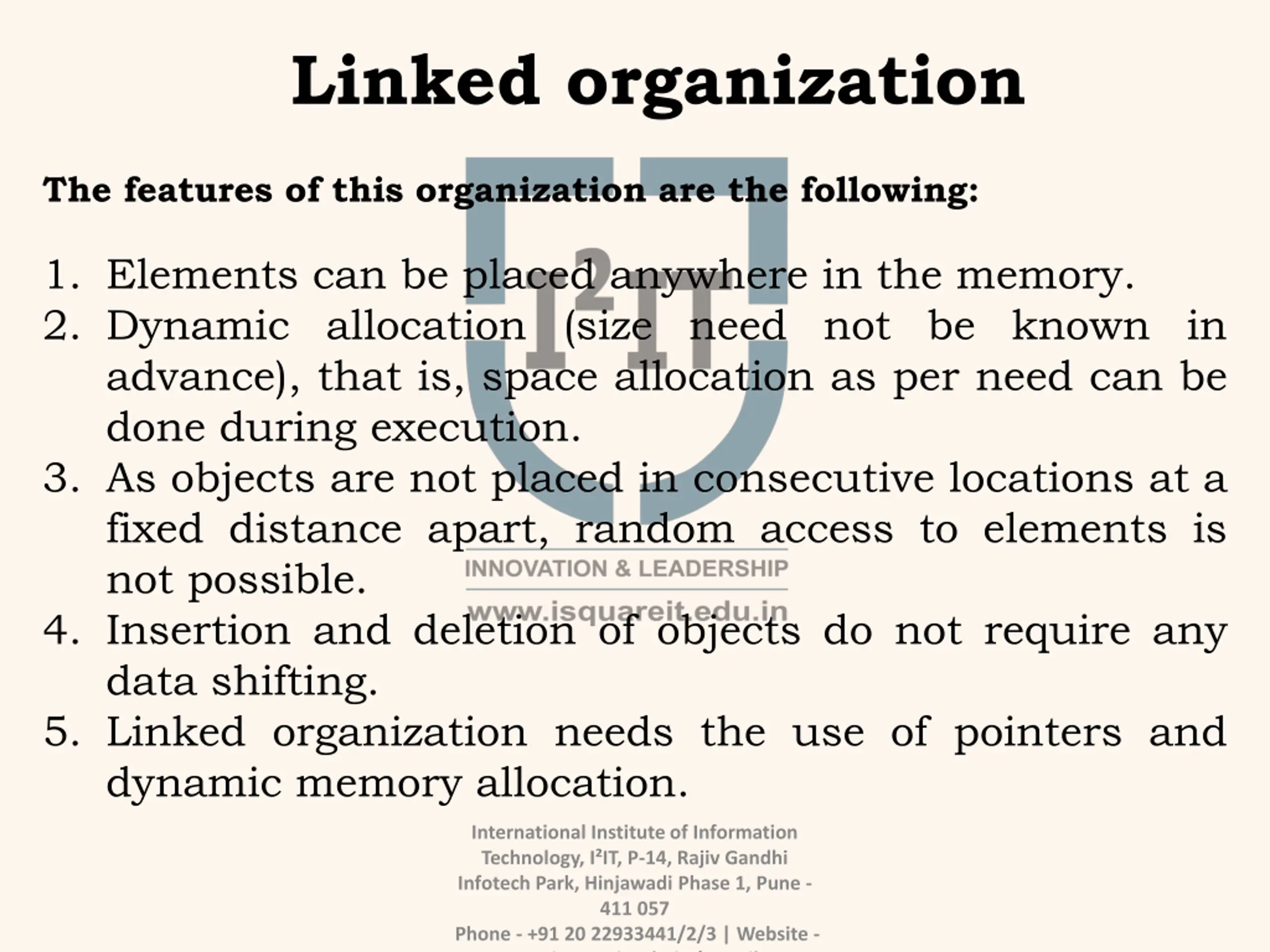 Linked organization The features of this organization are the following: 1. Elements can be placed anywhere in the memory. 2. Dynamic allocation (size need not be known in advance), that is, space allocation as per need can be done during execution. 3. As objects are not placed in consecutive locations at a fixed distance apart, random access to elements is not possible. 4. Insertion and deletion of objects do not require any data shifting. 5. Linked organization needs the use of pointers and dynamic memory allocation. International Institute of Information Technology, I IT, P-14, Rajiv Gandhi Infotech Park, Hinjawadi Phase 1, Pune - 411 057 Phone - +91 20 22933441/2/3 | Website - www.isquareit.edu.in | Email -