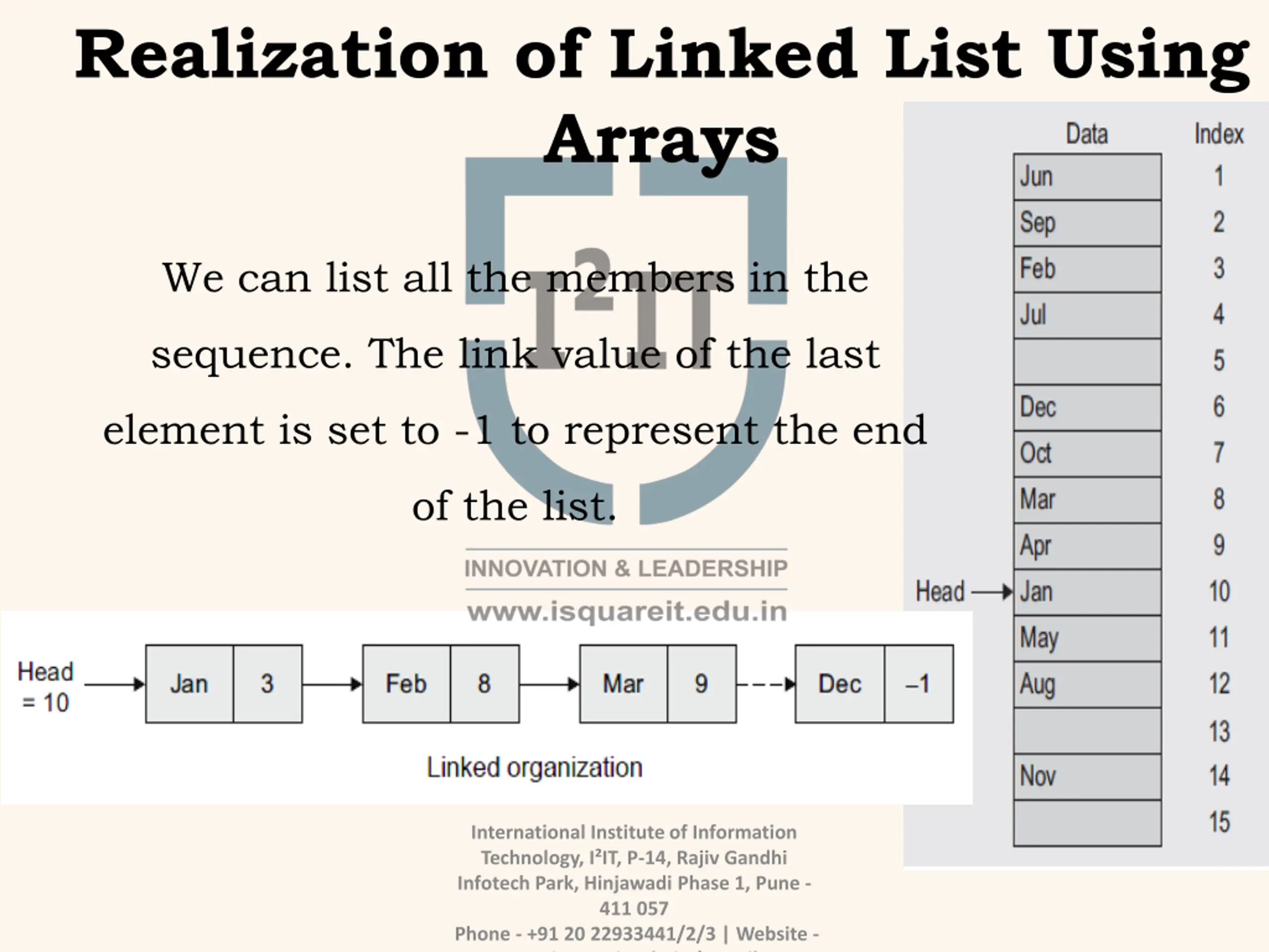 Realization of Linked List Using Arrays We can list all the members in the sequence. The link value of the last element is set to -1 to represent the end of the list. International Institute of Information Technology, I IT, P-14, Rajiv Gandhi Infotech Park, Hinjawadi Phase 1, Pune - 411 057 Phone - +91 20 22933441/2/3 | Website - www.isquareit.edu.in | Email -
