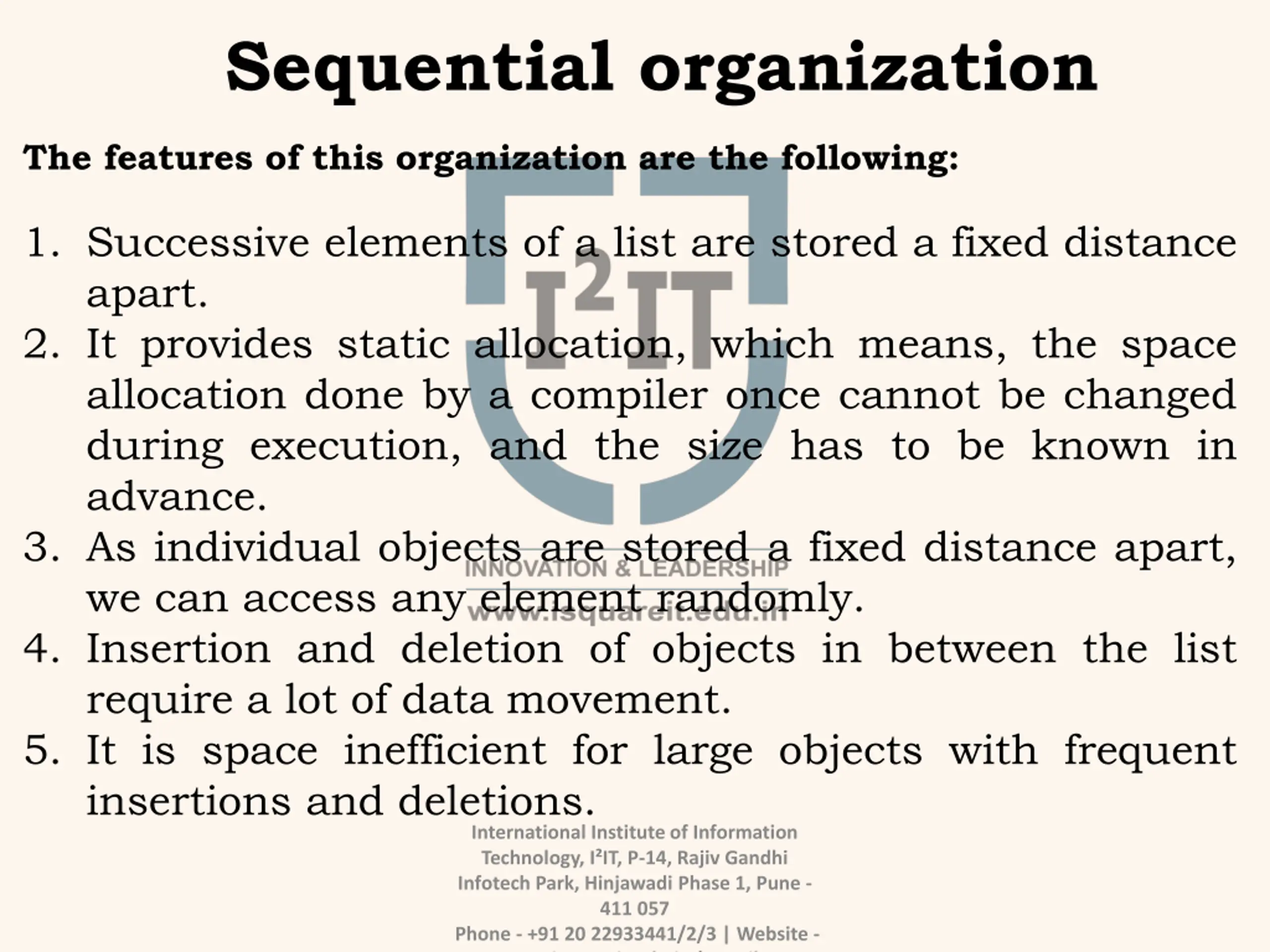 Sequential organization The features of this organization are the following: 1. Successive elements of a list are stored a fixed distance apart. 2. It provides static allocation, which means, the space allocation done by a compiler once cannot be changed during execution, and the size has to be known in advance. 3. As individual objects are stored a fixed distance apart, we can access any element randomly. 4. Insertion and deletion of objects in between the list require a lot of data movement. 5. It is space inefficient for large objects with frequent insertions and deletions. International Institute of Information Technology, I IT, P-14, Rajiv Gandhi Infotech Park, Hinjawadi Phase 1, Pune - 411 057 Phone - +91 20 22933441/2/3 | Website - www.isquareit.edu.in | Email -