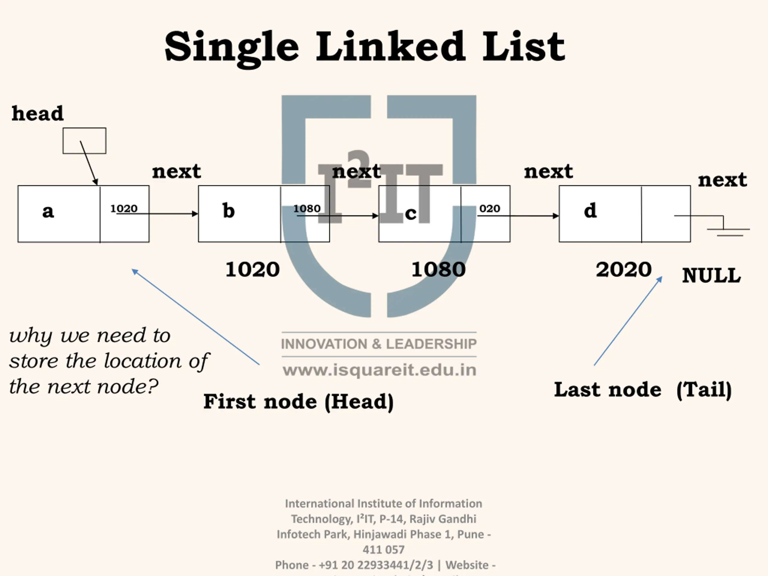 Single Linked List head next next next next a b d c 1020 1080 020 1020 1080 2020 NULL why we need to store the location of the next node? Last node (Tail) First node (Head) International Institute of Information Technology, I IT, P-14, Rajiv Gandhi Infotech Park, Hinjawadi Phase 1, Pune - 411 057 Phone - +91 20 22933441/2/3 | Website - www.isquareit.edu.in | Email -