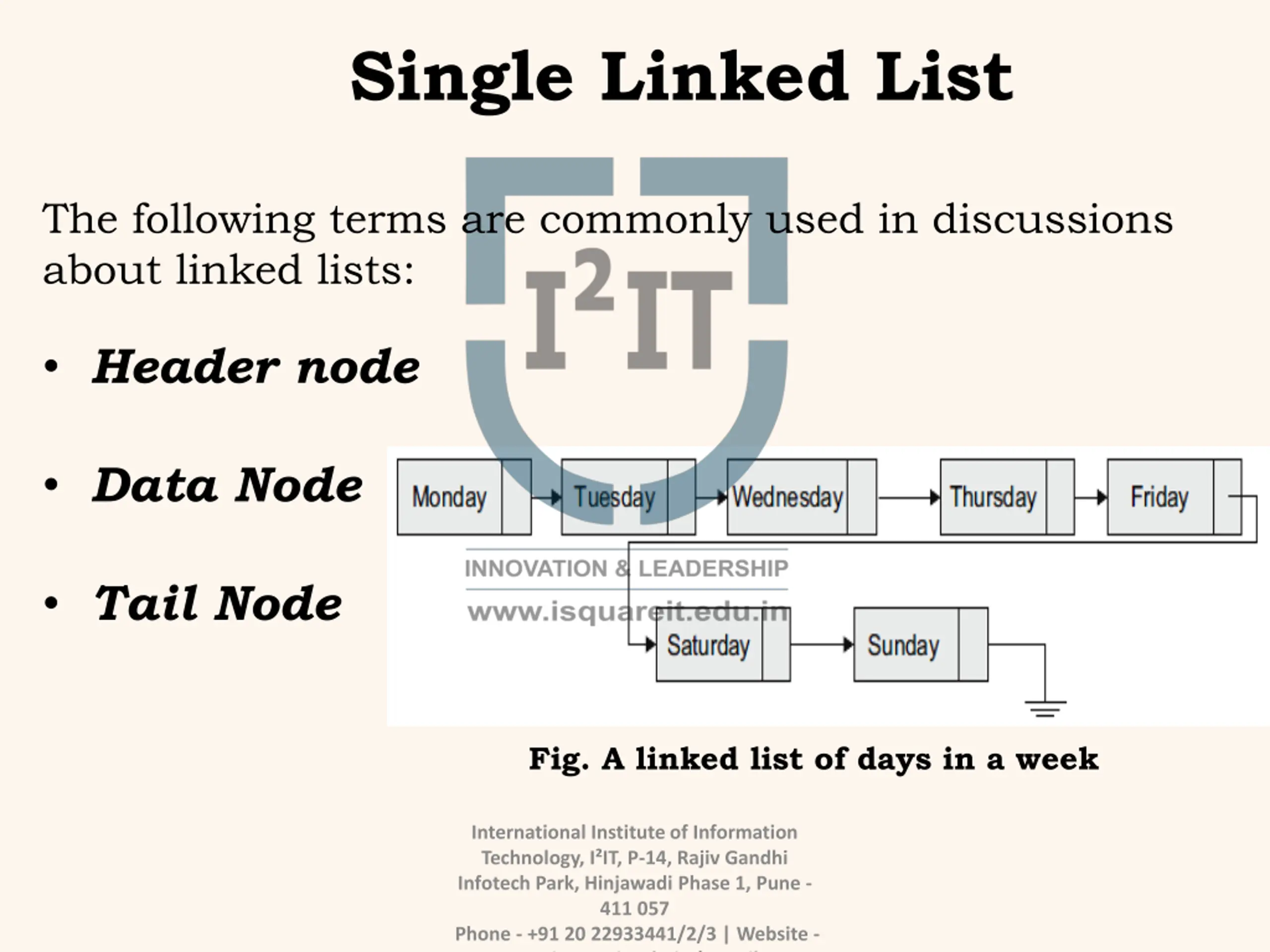Single Linked List The following terms are commonly used in discussions about linked lists: Header node Data Node Tail Node Fig. A linked list of days in a week International Institute of Information Technology, I IT, P-14, Rajiv Gandhi Infotech Park, Hinjawadi Phase 1, Pune - 411 057 Phone - +91 20 22933441/2/3 | Website - www.isquareit.edu.in | Email -