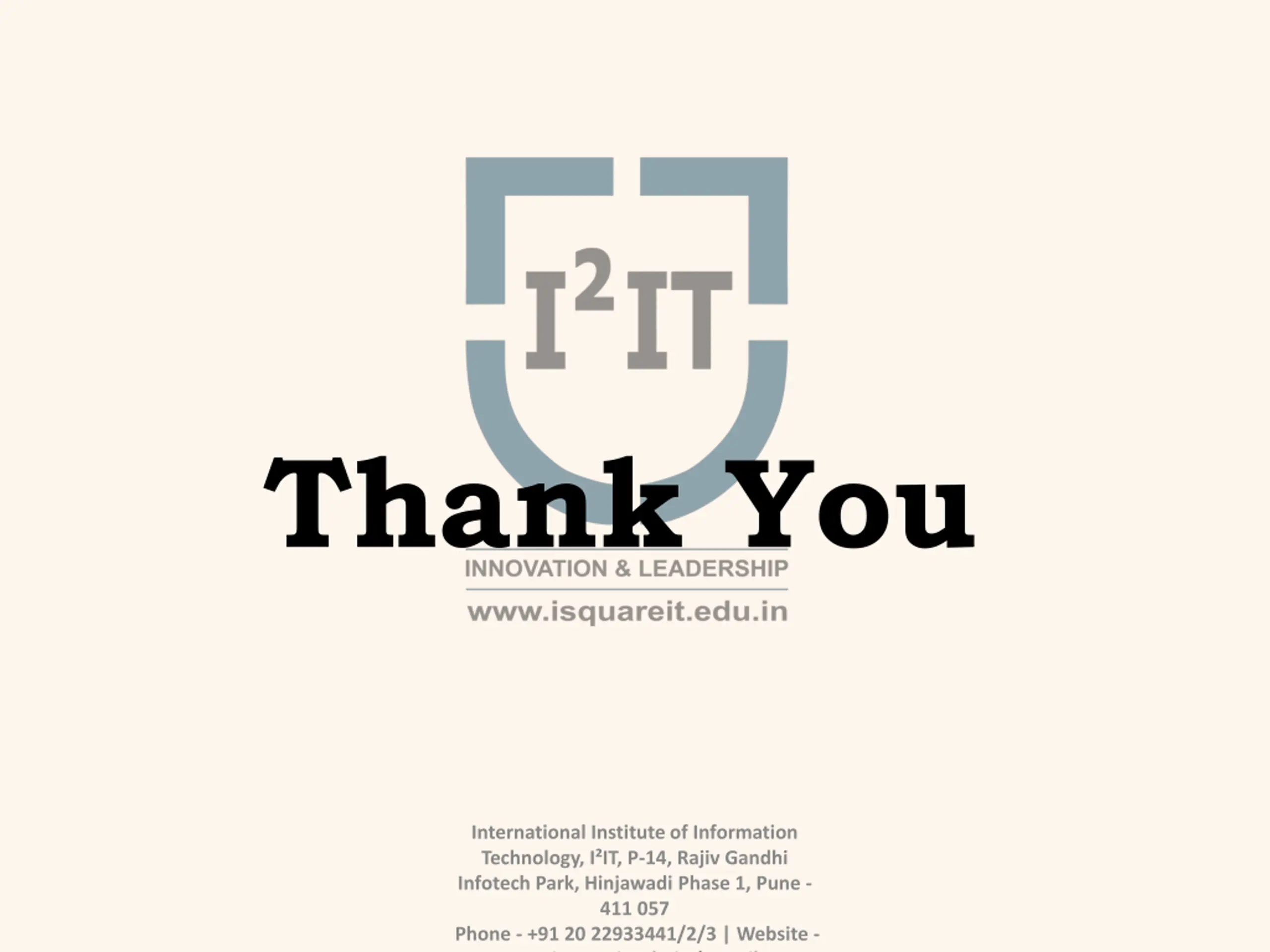 Thank You International Institute of Information Technology, I IT, P-14, Rajiv Gandhi Infotech Park, Hinjawadi Phase 1, Pune - 411 057 Phone - +91 20 22933441/2/3 | Website - www.isquareit.edu.in | Email -