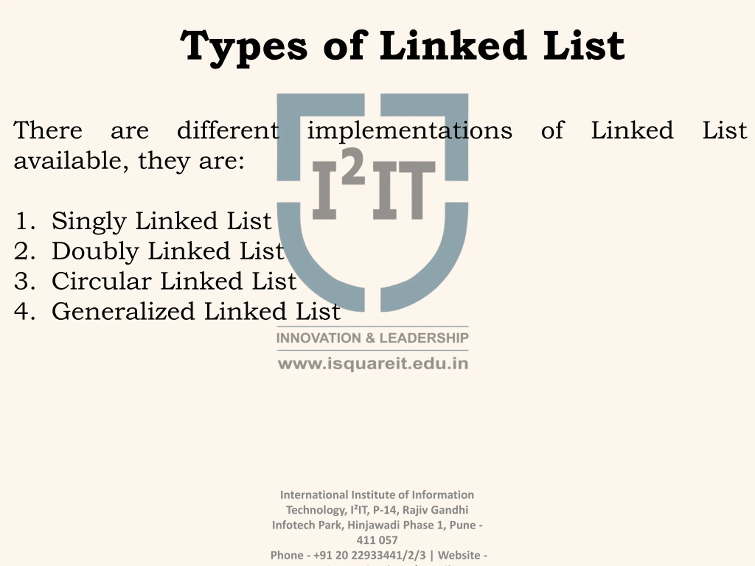 Types of Linked List There are different implementations of Linked List available, they are: 1. Singly Linked List 2. Doubly Linked List 3. Circular Linked List 4. Generalized Linked List International Institute of Information Technology, I IT, P-14, Rajiv Gandhi Infotech Park, Hinjawadi Phase 1, Pune - 411 057 Phone - +91 20 22933441/2/3 | Website - www.isquareit.edu.in | Email -