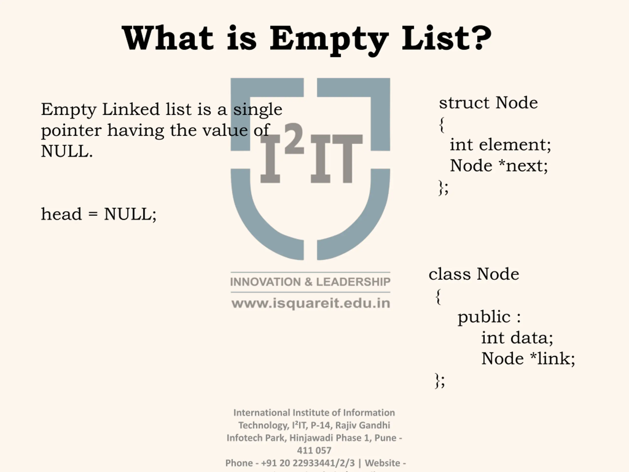 What is Empty List? struct Node { int element; Node *next; }; Empty Linked list is a single pointer having the value of NULL. head = NULL; class Node { public : }; int data; Node *link; International Institute of Information Technology, I IT, P-14, Rajiv Gandhi Infotech Park, Hinjawadi Phase 1, Pune - 411 057 Phone - +91 20 22933441/2/3 | Website - www.isquareit.edu.in | Email -