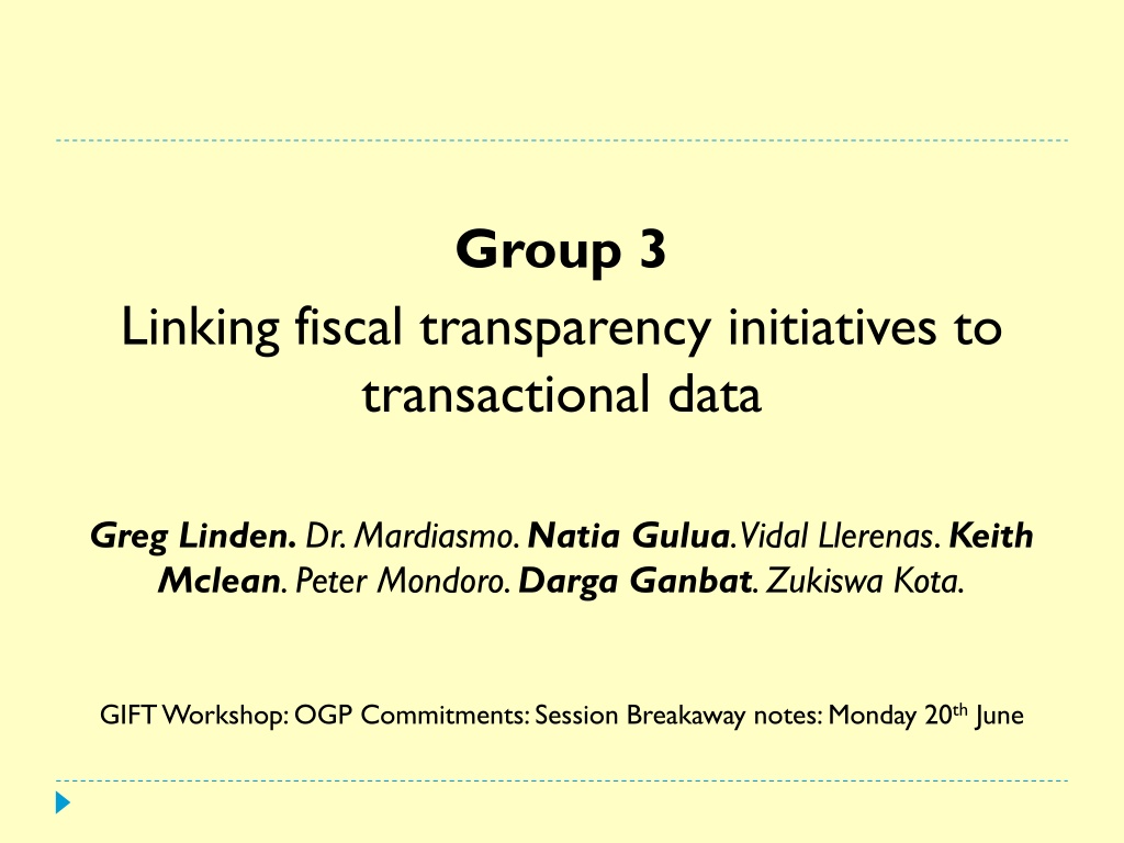 Group 3 Linking fiscal transparency initiatives to transactional data Greg Linden. Dr. Mardiasmo. Natia Gulua. Vidal Llerenas. Keith Mclean. Peter Mondoro. Darga Ganbat. Zukiswa Kota. GIFT Workshop: OGP Commitments: Session Breakaway notes: Monday 20thJune