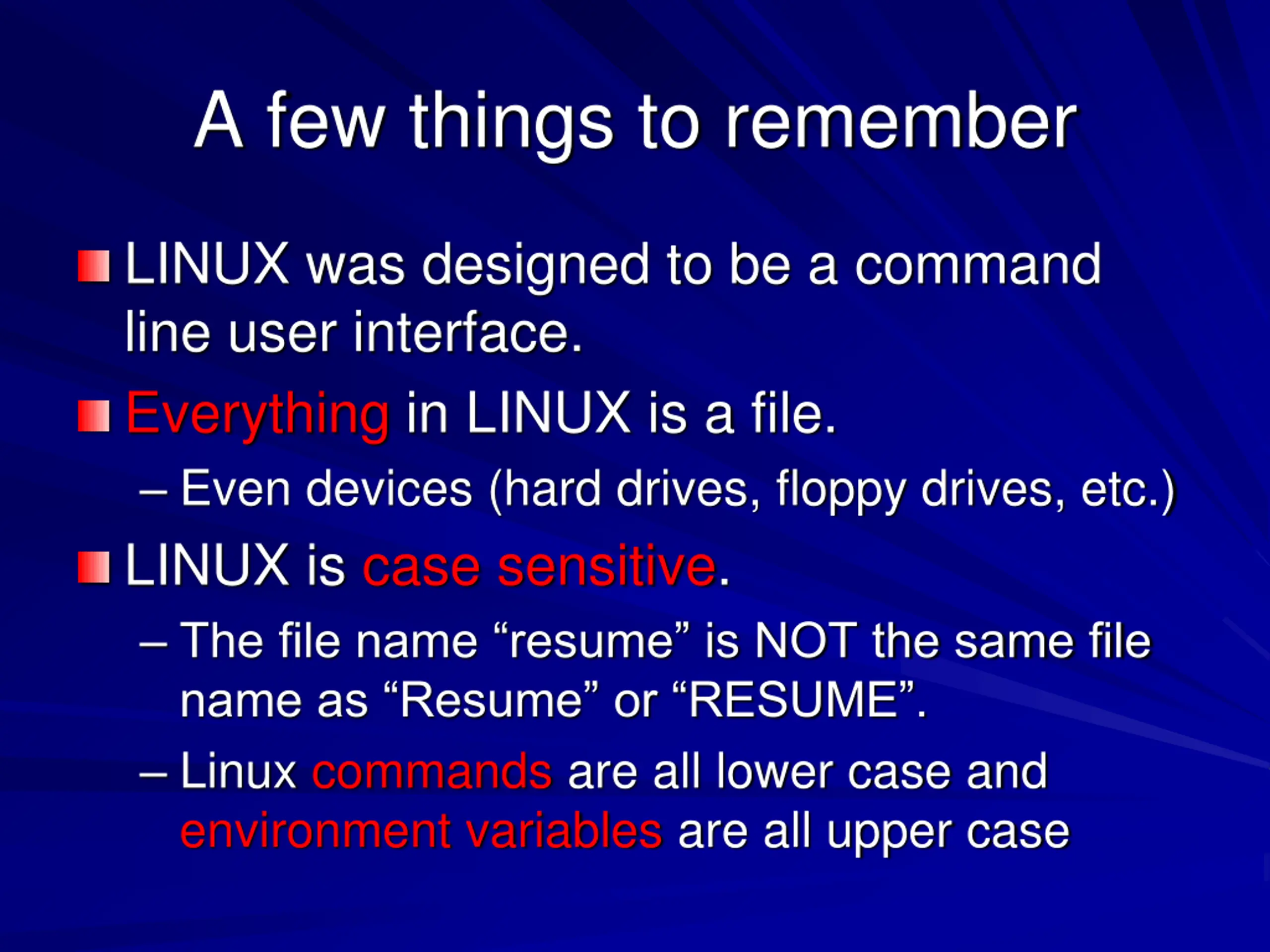 A few things to remember LINUX was designed to be a command line user interface. Everything in LINUX is a file. Even devices (hard drives, floppy drives, etc.) LINUX is case sensitive. The file name resume is NOT the same file name as Resume or RESUME . Linux commands are all lower case and environment variables are all upper case