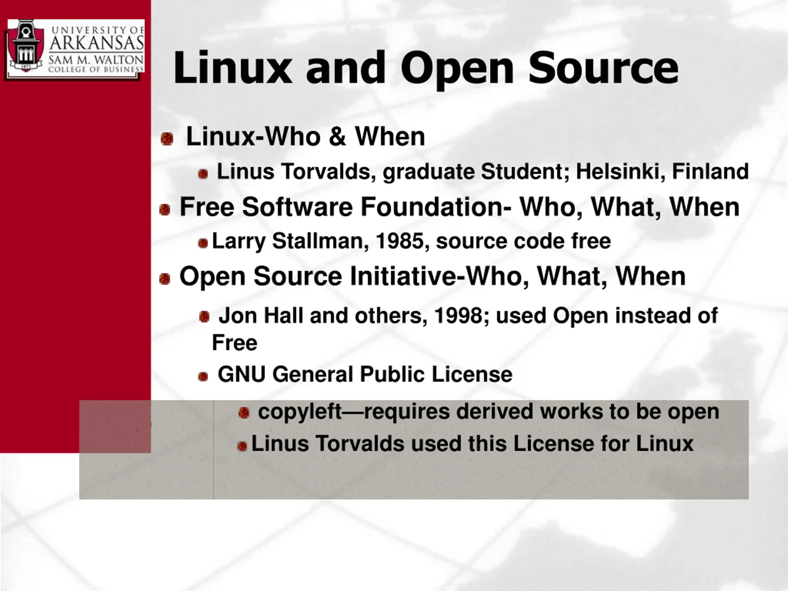 Linux and Open Source Linux-Who & When Linus Torvalds, graduate Student; Helsinki, Finland Free Software Foundation- Who, What, When Larry Stallman, 1985, source code free Open Source Initiative-Who, What, When Jon Hall and others, 1998; used Open instead of Free GNU General Public License copyleft requires derived works to be open Linus Torvalds used this License for Linux