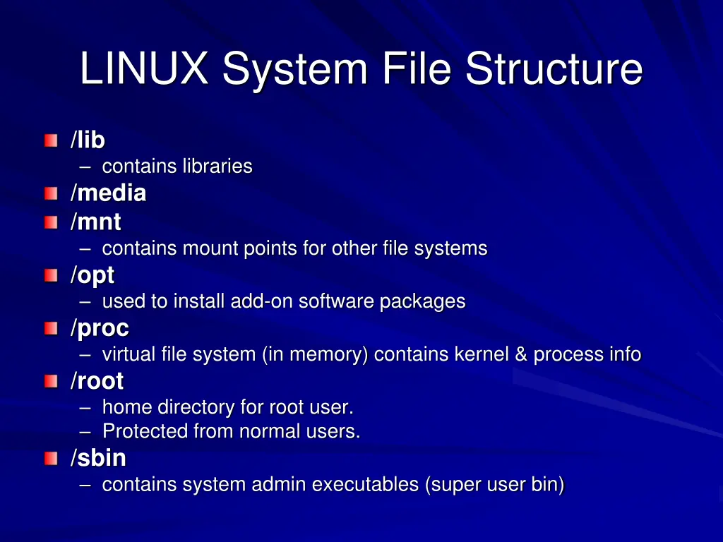LINUX System File Structure /lib contains libraries /media /mnt contains mount points for other file systems /opt used to install add-on software packages /proc virtual file system (in memory) contains kernel &process info /root home directory for root user. Protected from normal users. /sbin contains system admin executables (super user bin)