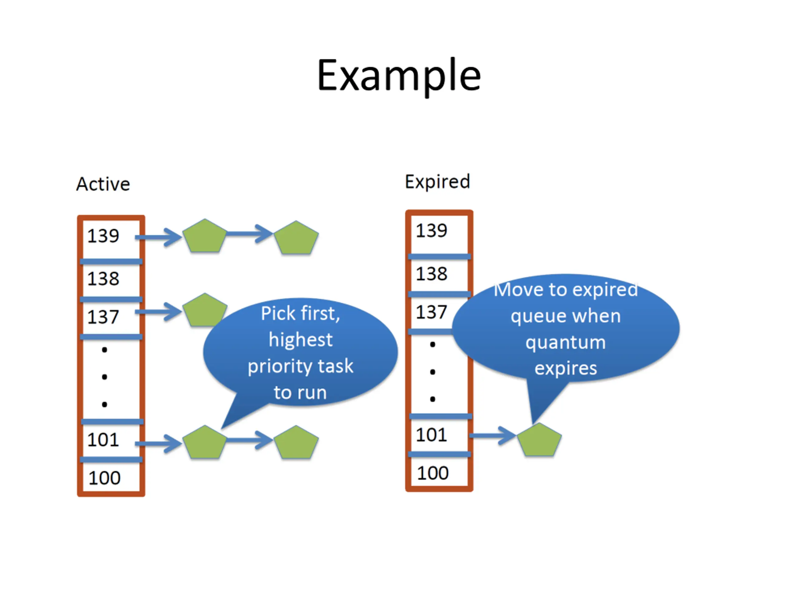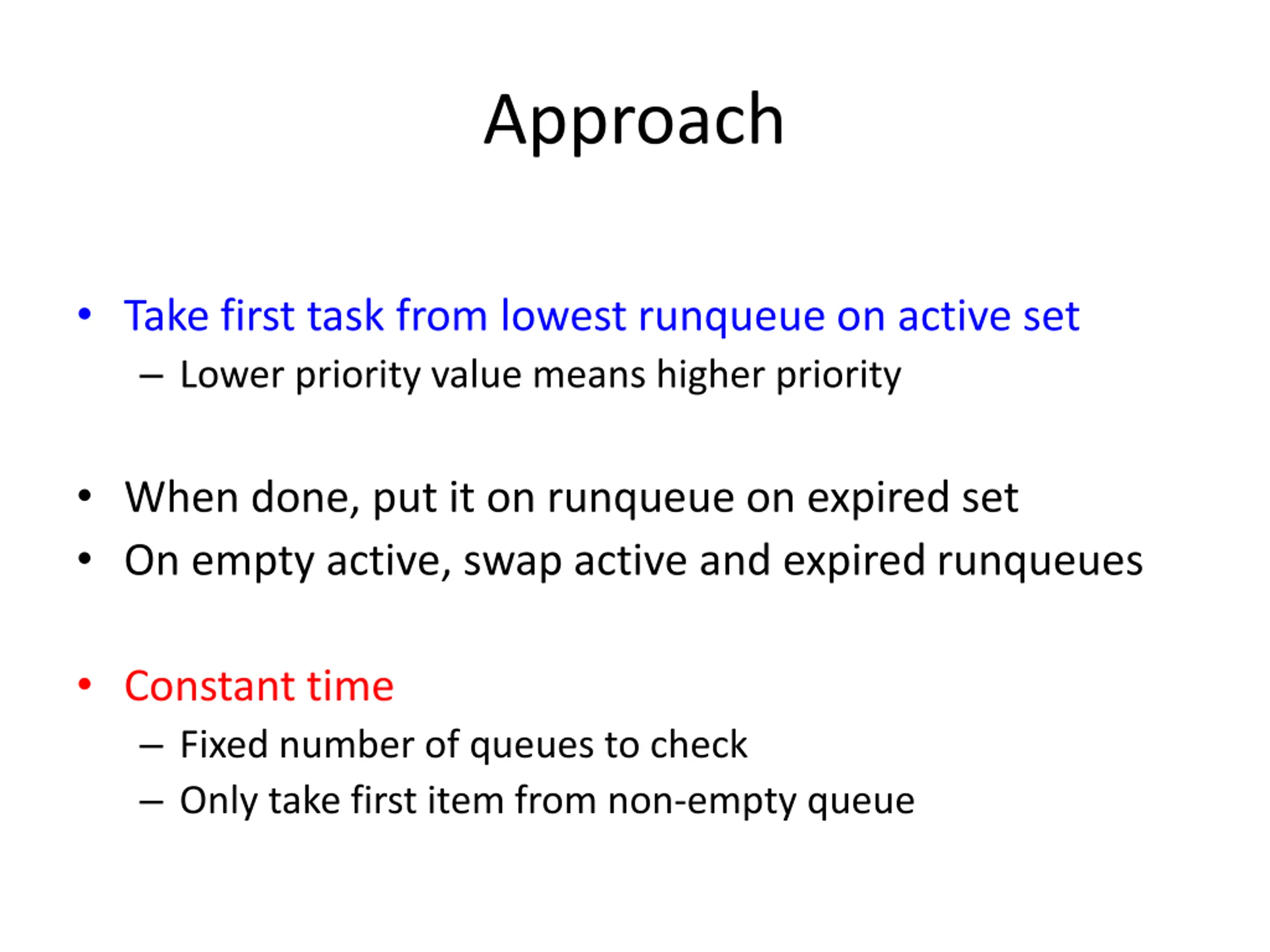 Approach Take first task from lowest runqueue on active set Lower priority value means higher priority When done, put it on runqueue on expired set On empty active, swap active and expired runqueues Constant time Fixed number of queues to check Only take first item from non-empty queue