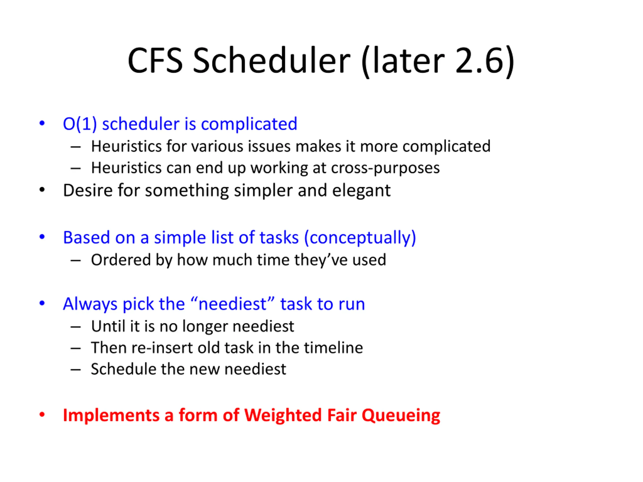 CFS Scheduler (later 2.6) O(1) scheduler is complicated Heuristics for various issues makes it more complicated Heuristics can end up working at cross-purposes Desire for something simpler and elegant Based on a simple list of tasks (conceptually) Ordered by how much time they ve used Always pick the neediest task to run Until it is no longer neediest Then re-insert old task in the timeline Schedule the new neediest Implements a form of Weighted Fair Queueing