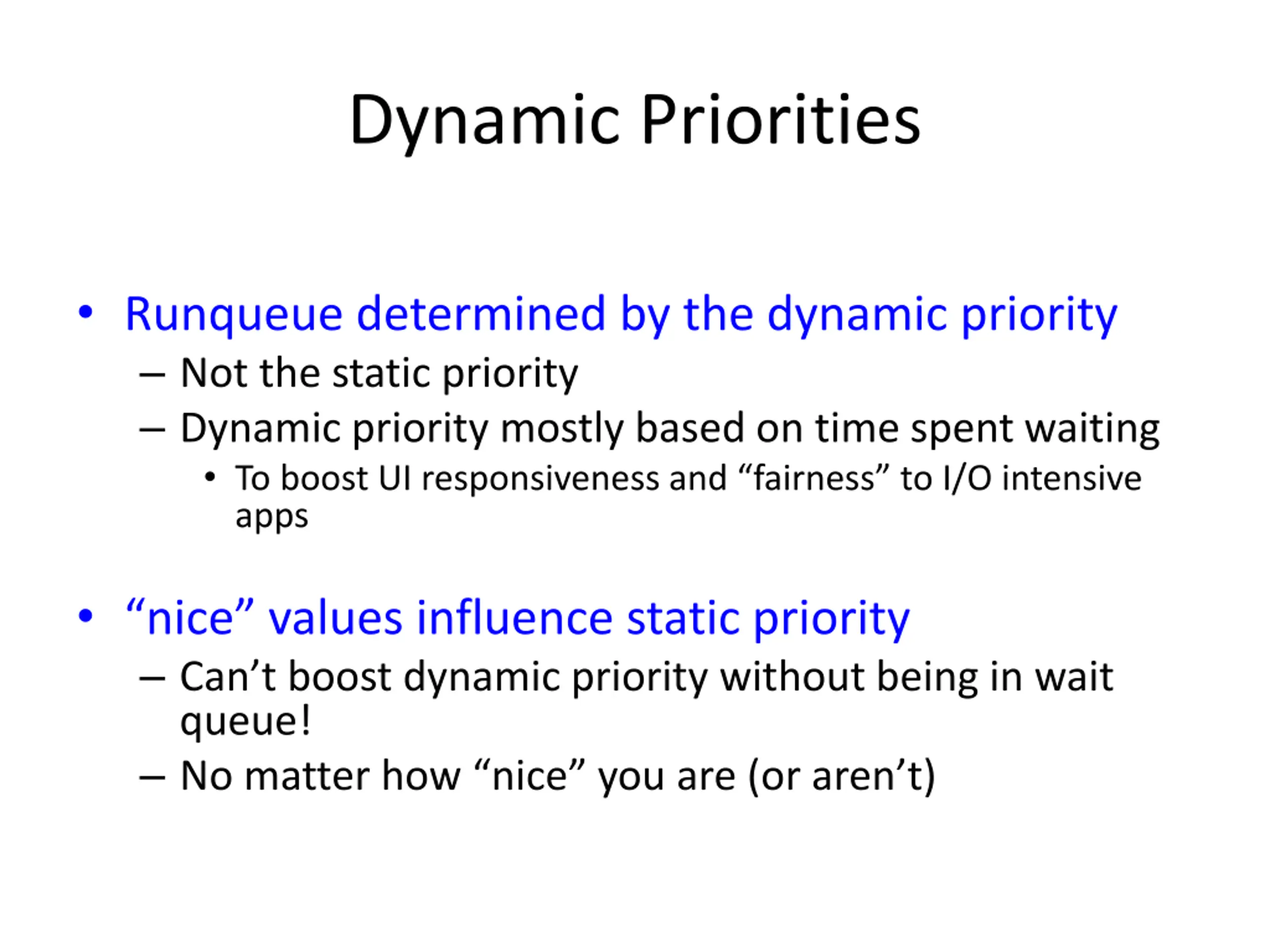 Dynamic Priorities Runqueue determined by the dynamic priority Not the static priority Dynamic priority mostly based on time spent waiting To boost UI responsiveness and fairness to I/O intensive apps nice values influence static priority Can t boost dynamic priority without being in wait queue! No matter how nice you are (or aren t)