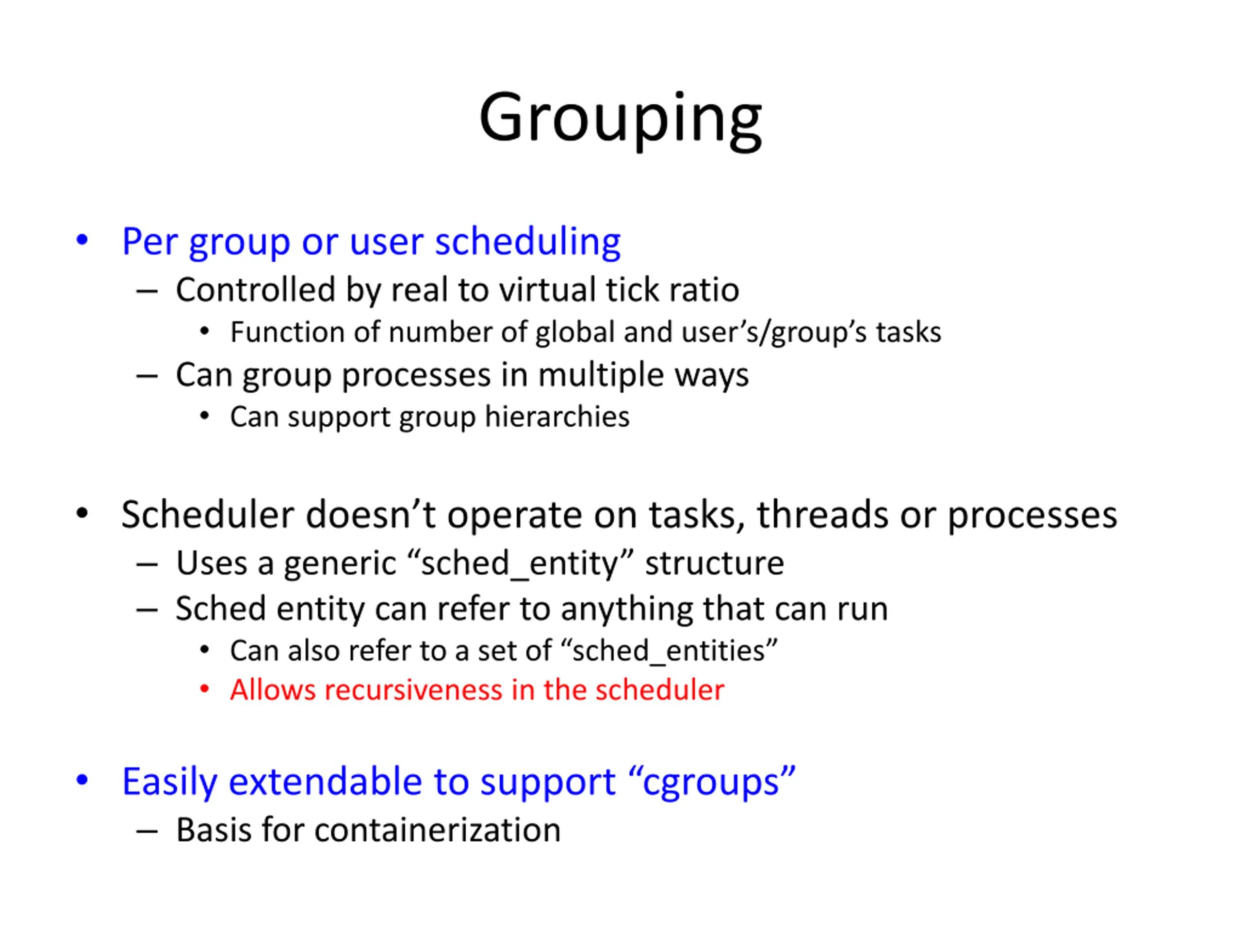Grouping Per group or user scheduling Controlled by real to virtual tick ratio Function of number of global and user s/group s tasks Can group processes in multiple ways Can support group hierarchies Scheduler doesn t operate on tasks, threads or processes Uses a generic sched_entity structure Sched entity can refer to anything that can run Can also refer to a set of sched_entities Allows recursiveness in the scheduler Easily extendable to support cgroups Basis for containerization